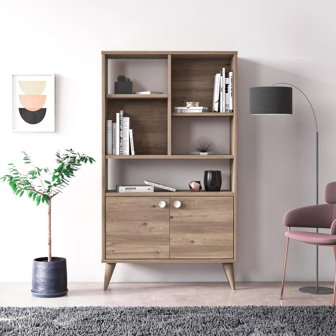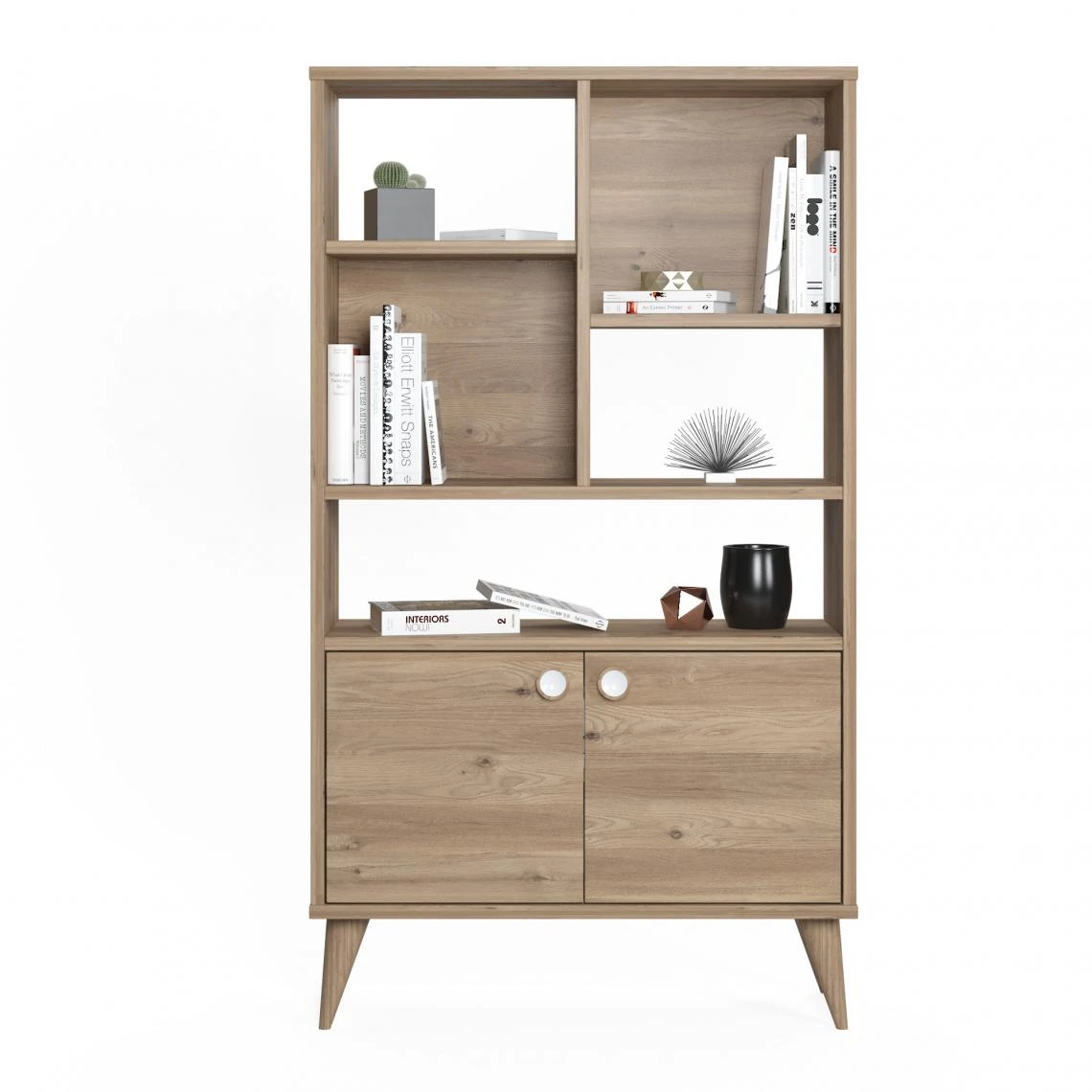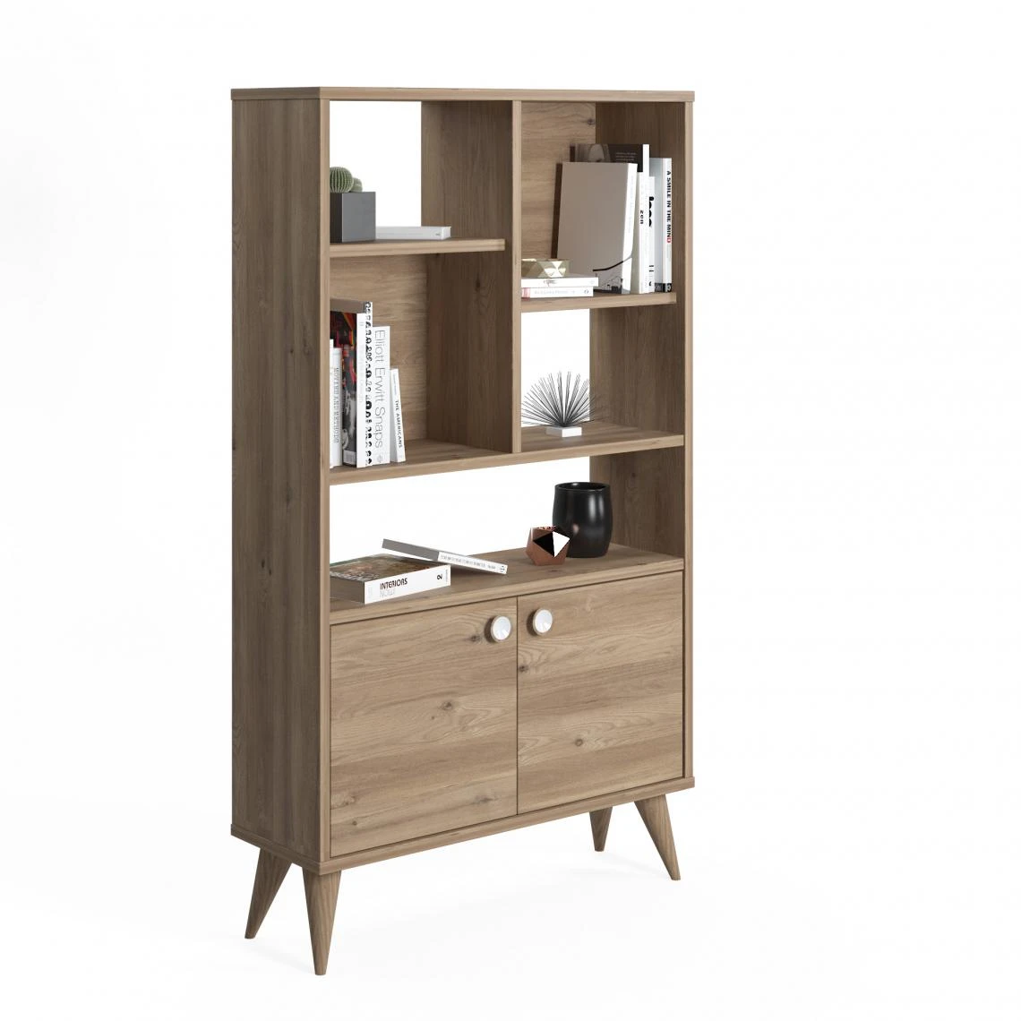 Points forts Alter Bibliothèque à deux portes battantes et cinq compartiments ouverts, 75 x 25 x 131 cm, couleur chêne