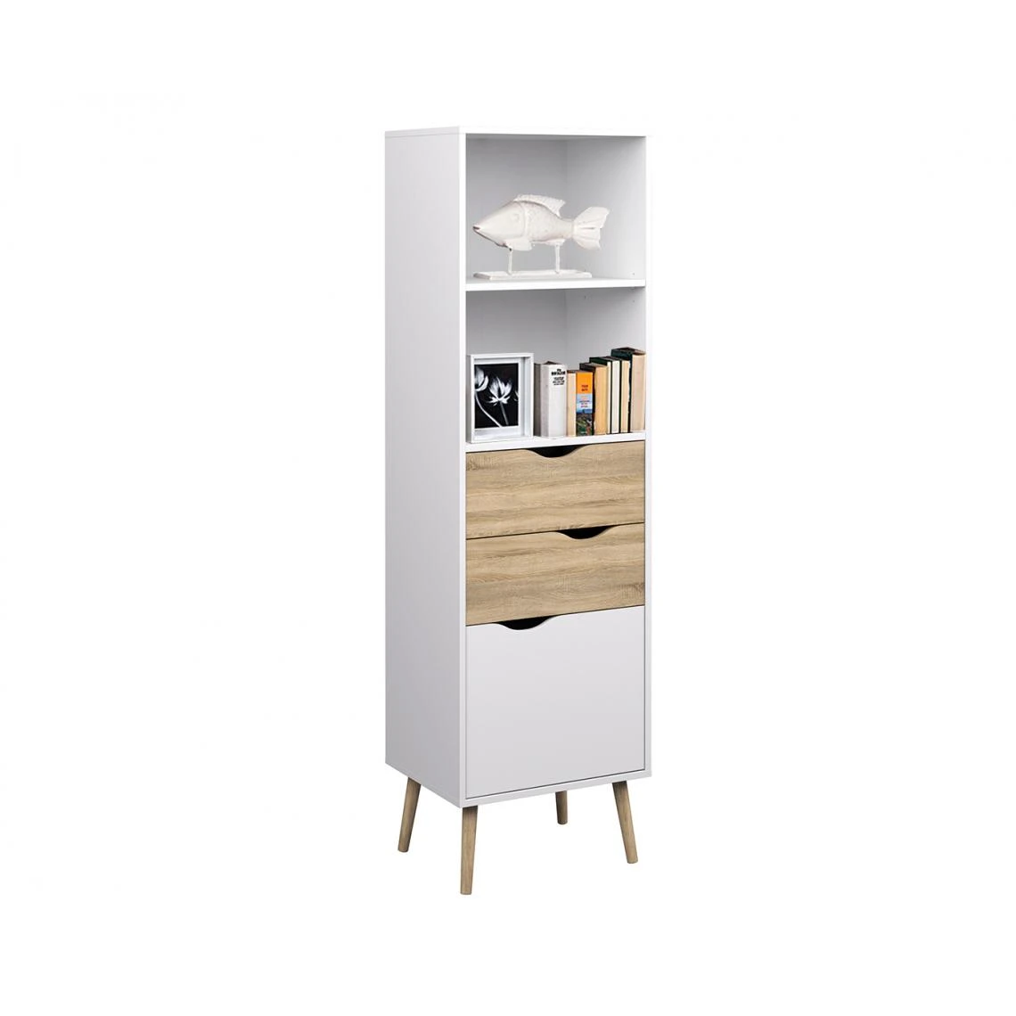 Points forts Alter Bibliothèque de style scandinave avec deux étagères, deux tiroirs et une porte, blanc et chêne, mesure 50 x 171 x 39 cm