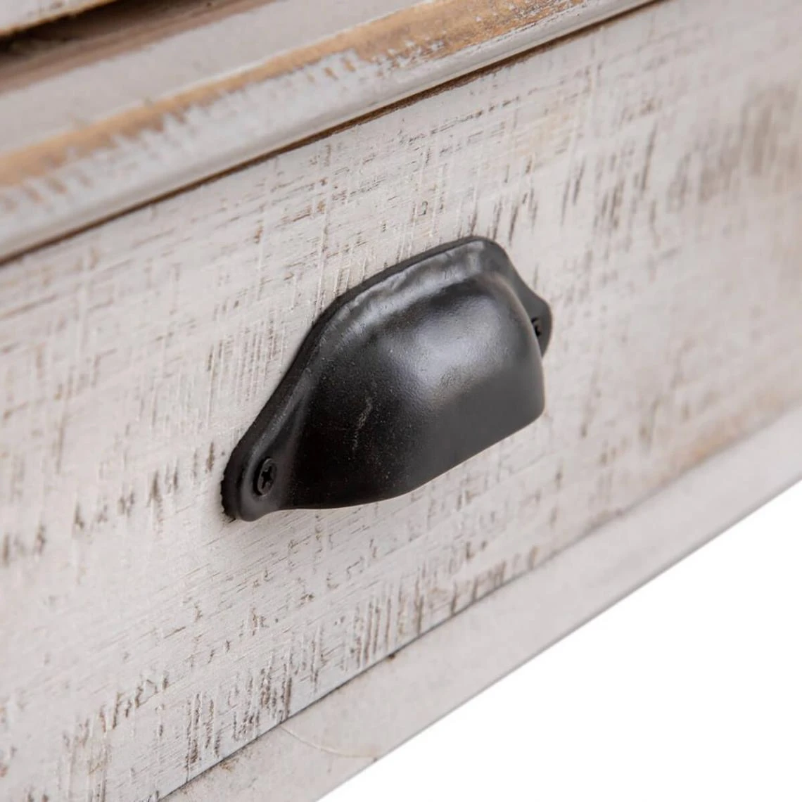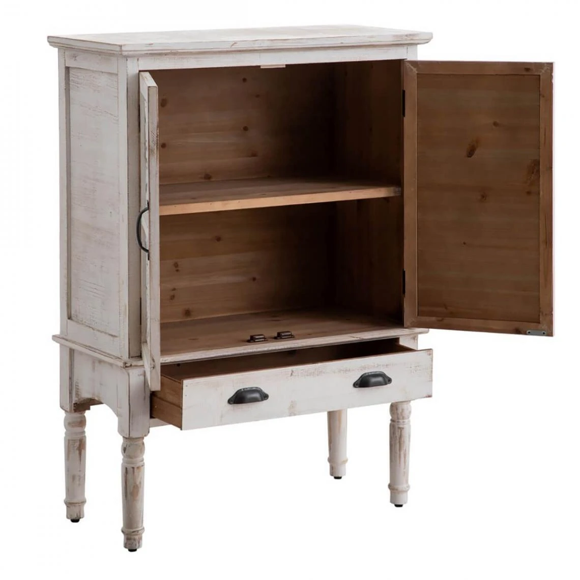 Structure en pin massif et en MDF. Extérieur coloris blanc aspect vieilli. Intérieur coloris naturel. Poignées métalliques.