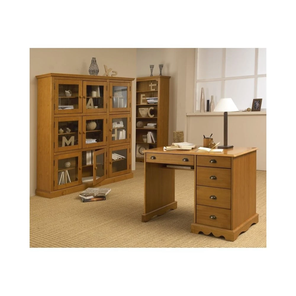 Bibliothèque 9 Portes Vitrées Pin Miel de Style Anglais. Largeur 163 cm Hauteur 170 cm Profondeur 37 cm. Descriptif : – 9 portes vitrées. – 3 grandes tablettes réglables en hauteur – 3 petites tablettes réglables en hauteur Caractéristiques techniques : – Structure en Pin Massif panneauté, replaqué pin teinté miel. (Cette technique de fabrication évite aux panneaux pin massif de se déformer) – Finition semi-antiquaire (meuble légèrement vieilli : petits trous noirs). – Meuble livré démonté (montage facile – Pour faciliter le montage, les socles et les charnières sont livrés pré-montés. – Garantie 2 ans. – Bois issus de forêts gérées durablement. Livraison gratuite, sous une semaine, du lundi au vendredi, au rez-de-chaussée.