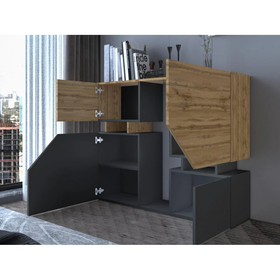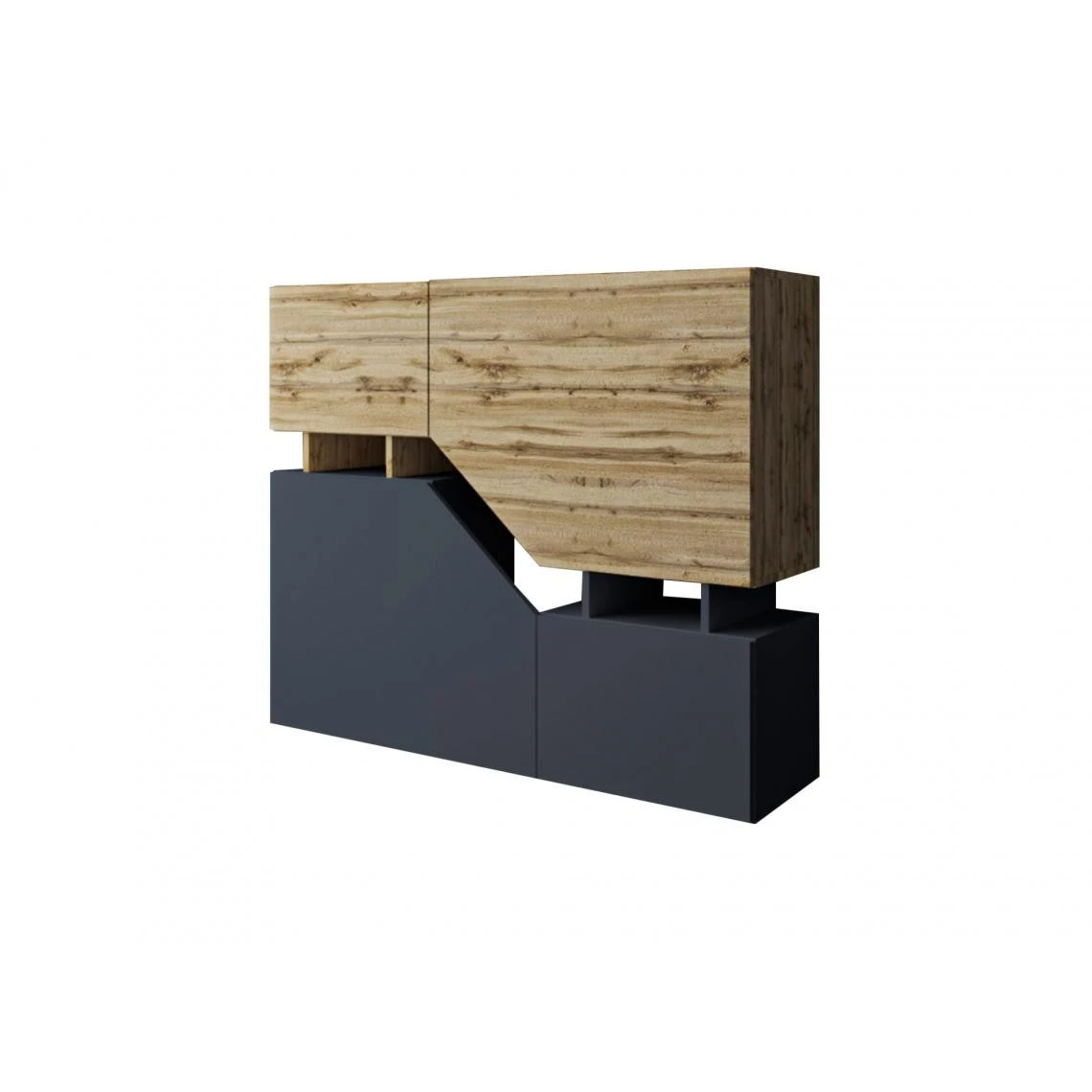 Le buffet Pitt se distingue à la fois par son style minimaliste, avec ses quatre armoires sans poignées, et sa structure géométrique très intéressante et originale, qui, combinée aux couleurs utilisées, s’intègre parfaitement dans le caractère des intérieurs modernes et loft.