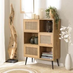 MACABANE Buffet Marron 5 Portes Bois De Manguier Et Cannage Naturel ISA
