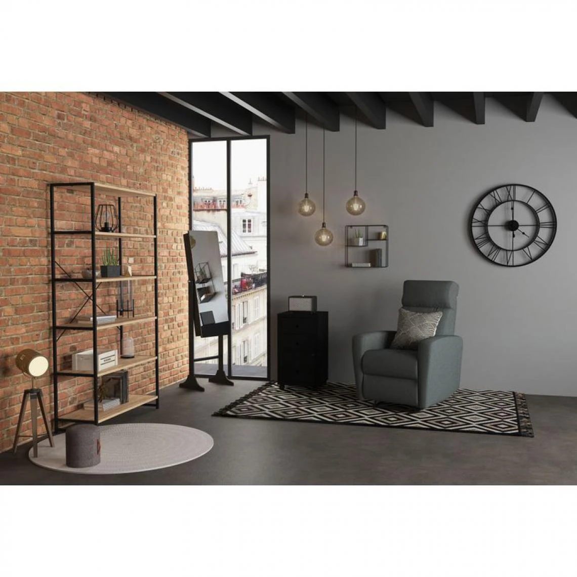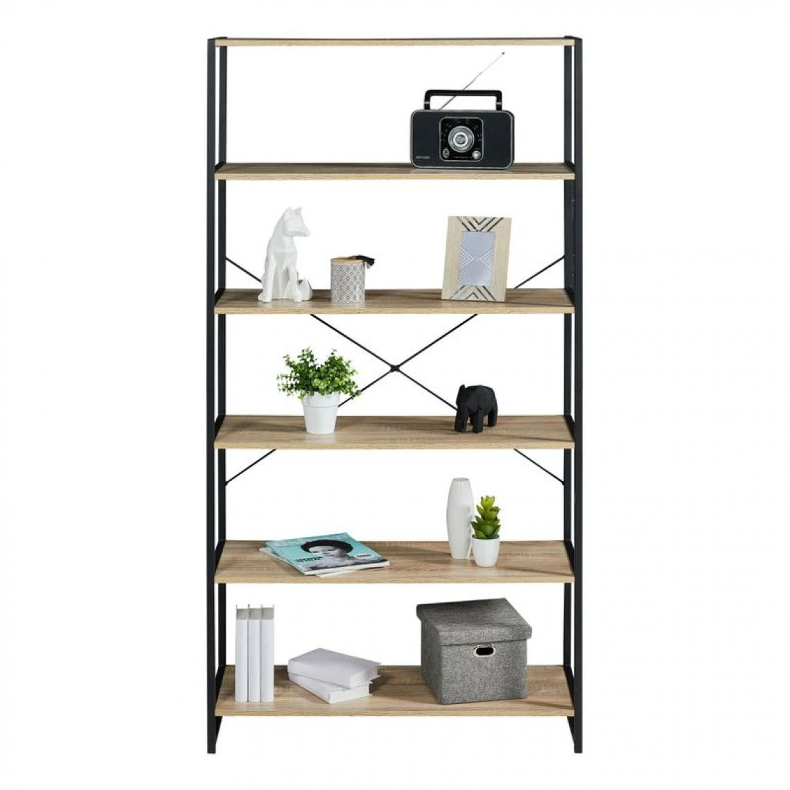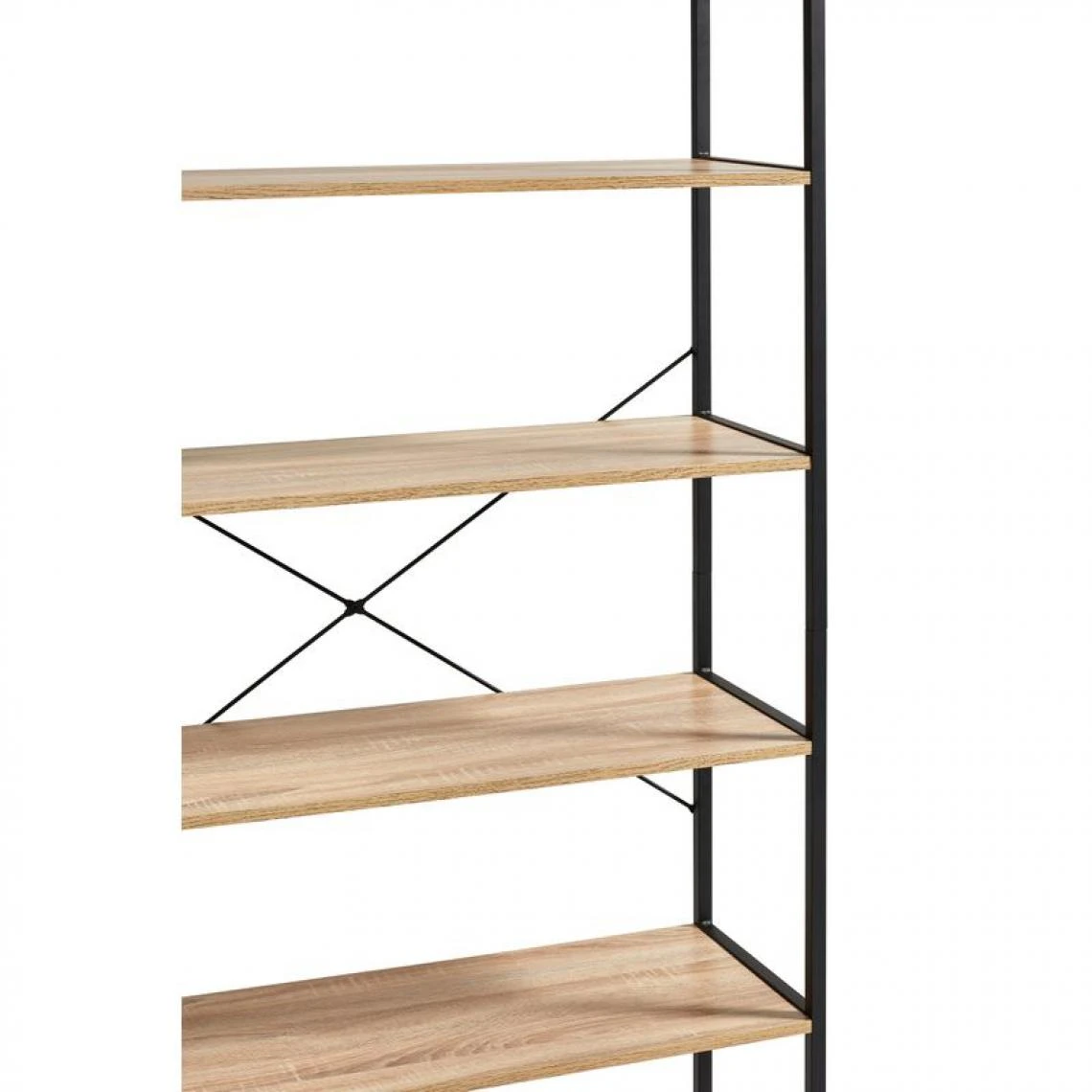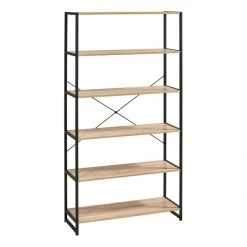 Cette bibliothèque noire et imitation chêne rejoint une décoration industrielle avec brio, mais peut s’associer à un style plus personnalisé. Sa structure en acier, alliée aux tablettes en panneaux de particules, en fait un meuble solide. On l’adopte sans tarder pour apporter une touche chic à son coin lecture.