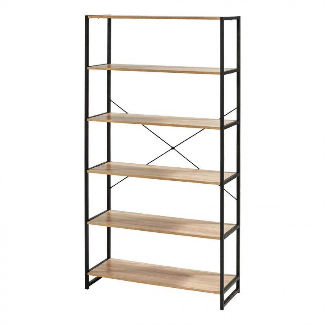 Finition :PVC structuré imitation chêne. . Garantie :2 ans, pièces. . Structure :acier époxy noir. . Tablettes :panneaux de particules. . A monter soi-même. . Dimensions en cm :L. 95 – H. 180 – P. 35. Etagères x 5 : L.91 – H.32.3 – P.34 cm. . Poids max supporté:10 kg par niveau. . Dispo pcs détachées donnée fournisseur :NC. .