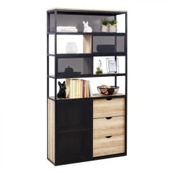 Cette bibliothèque noire et imitation chêne s’adapte aussi facilement aux intérieurs industriels qu’aux décorations contemporaines. Les parties grillagées au niveau des portes ou des étagères apportent une petite note originale à ses lignes sobres et classiques. Cette bibliothèque complète à merveille d’autres meubles en métal noir mat.