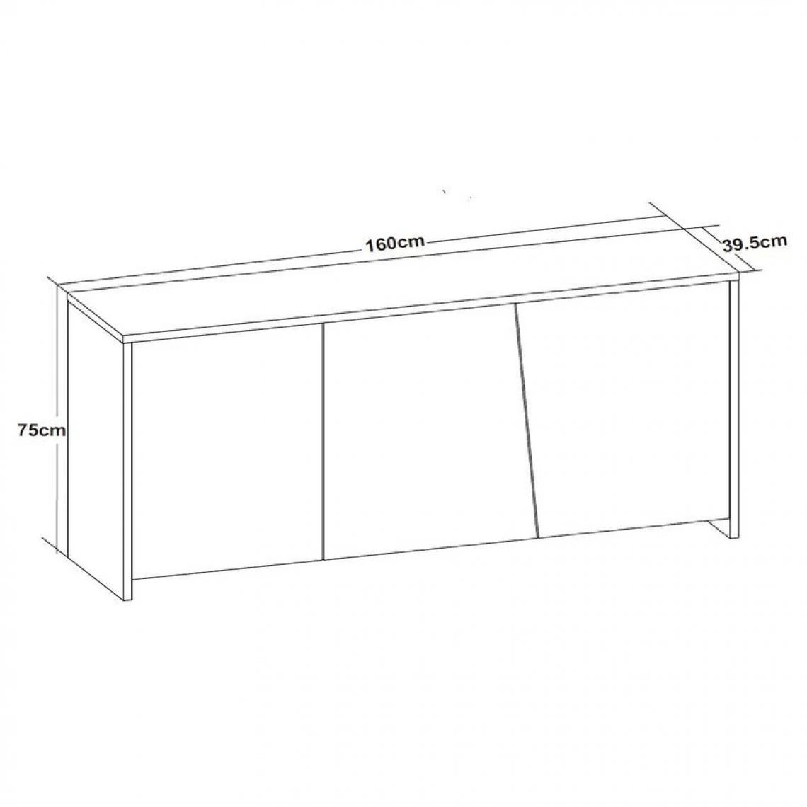 Porte :Système d’ouverture push-pull. . Portes :3 portes. Derrière chaque porte, 1 espace de rangement de dimensions L. 52 x l. 36 x H. 65,5 cm chacun, avec tablette ajustable pour chaque rangement. . Finition :Imitation chêne et blanc. . Garantie :2 ans, pièces. . Tablette :Espace entre la tablette inférieure et le sol : 5,9 cm. . Structure :En panneaux de fibres de densité moyenne mélaminés. . Charge maxi TV :45 kg. . A monter soi-mêmeOui. . Dimensions en cm :L. 160 x l. 39,5 x H. 75 cm. . Parties apparentes :µ . Dispo pcs détachées donnée fournisseur :0 an. .