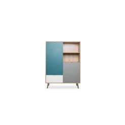 Les proportions parfaites (L103 x P40 x H139 cm) l’excellente contenance et la praticité du buffet Loarum permettent d’optimiser les espaces de la maison pour répartir les accessoires de la cuisine, la vaisselle, le service de table de manière plus ordonnée. Il présente des façades tricolores (vert pétrole, gris et blanc) et se compose d’une structure robuste avec 2 étagères ouvertes qui mettent en valeur les plus beaux objets de décoration, 2 compartiments de rangement fermés par des portes battantes et un tiroir coulissant pratique à la base. Chaque compartiment est divisé par une étagère centrale tandis que les pieds donnent un look rétro et confèrent un maintien parfait.