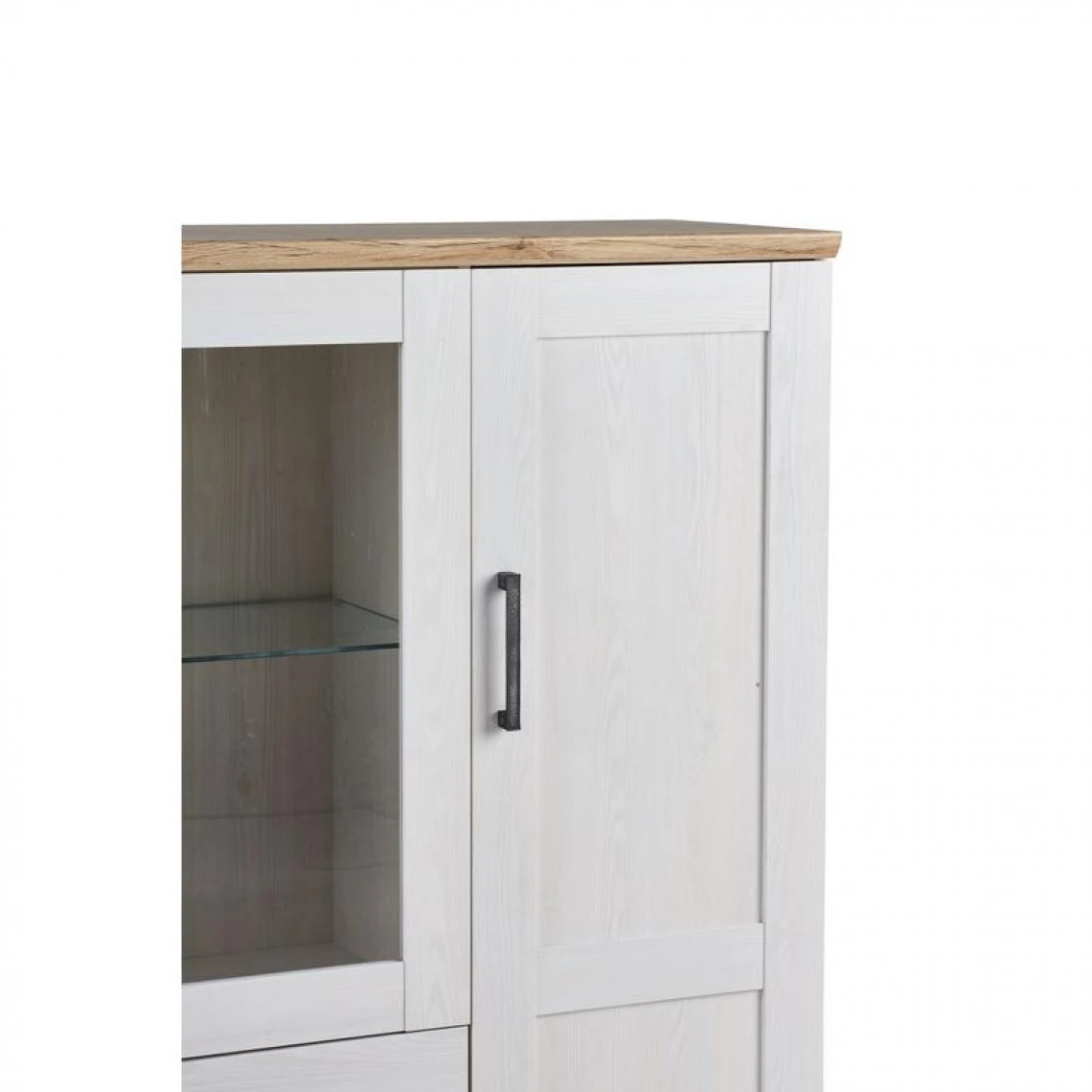 Ce buffet pin/chêne possède une double finition originale et lumineuse. Vous pourrez facilement l’assortir à une salle à manger dans des tons clairs, comme le blanc ou le beige. Un système d’éclairage à LED permet de souligner le contenu de la vitrine de ce buffet, pour un effet décoratif très réussi.