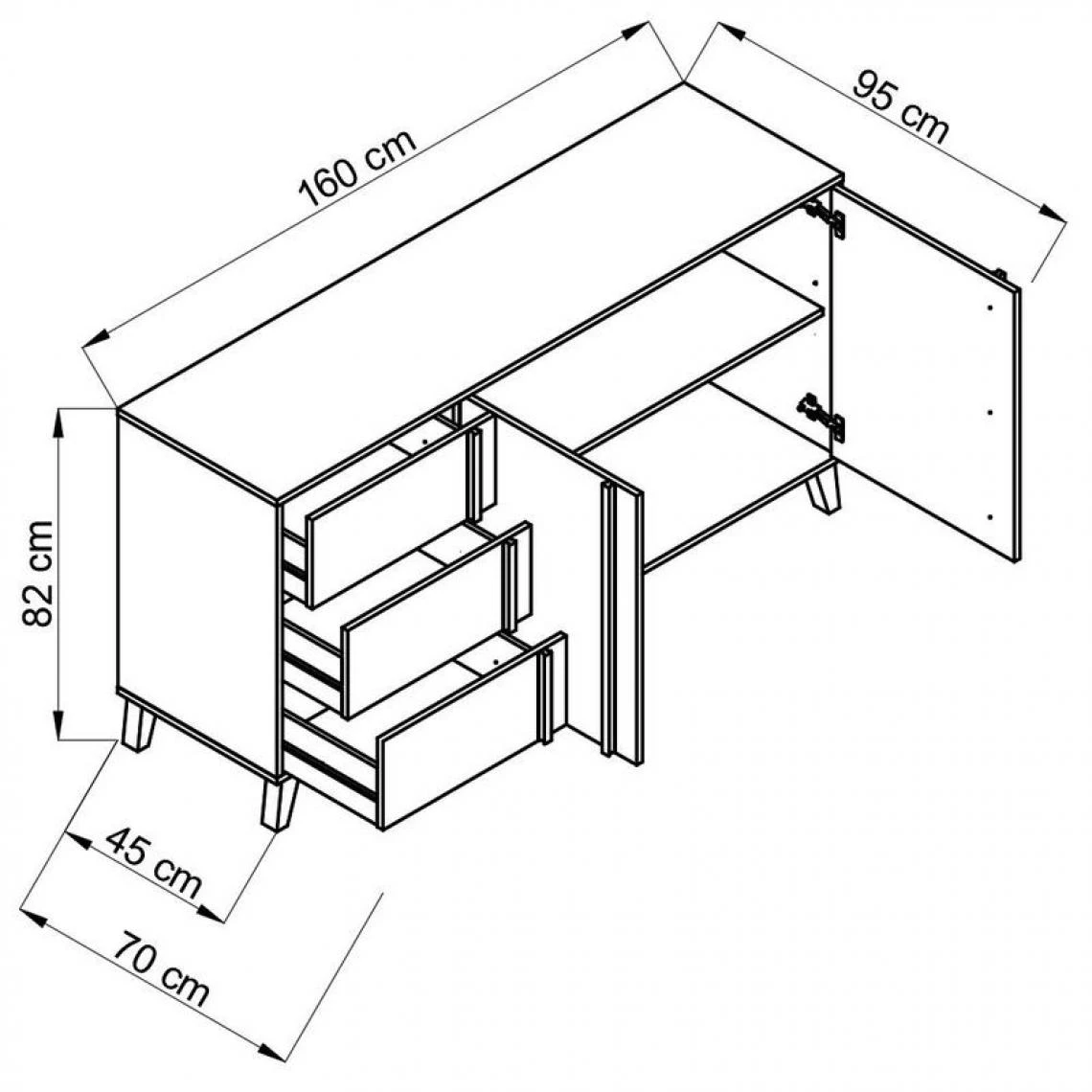 Portes :2 portes . Teinte :Mélanine noire pour la structure du meuble / Mélanime chêne pour les tiroirs et façades . Tiroirs :3 tiroirs . Garantie :2 ans, pièces . Poignées :Couleur noir . Structure :En panneaux de particules . A monter soi-mêmeOui . Dimensions en cm :L.160 x H.82 x l.45 cm . Dispo pcs détachées donnée fournisseur :2 ans .