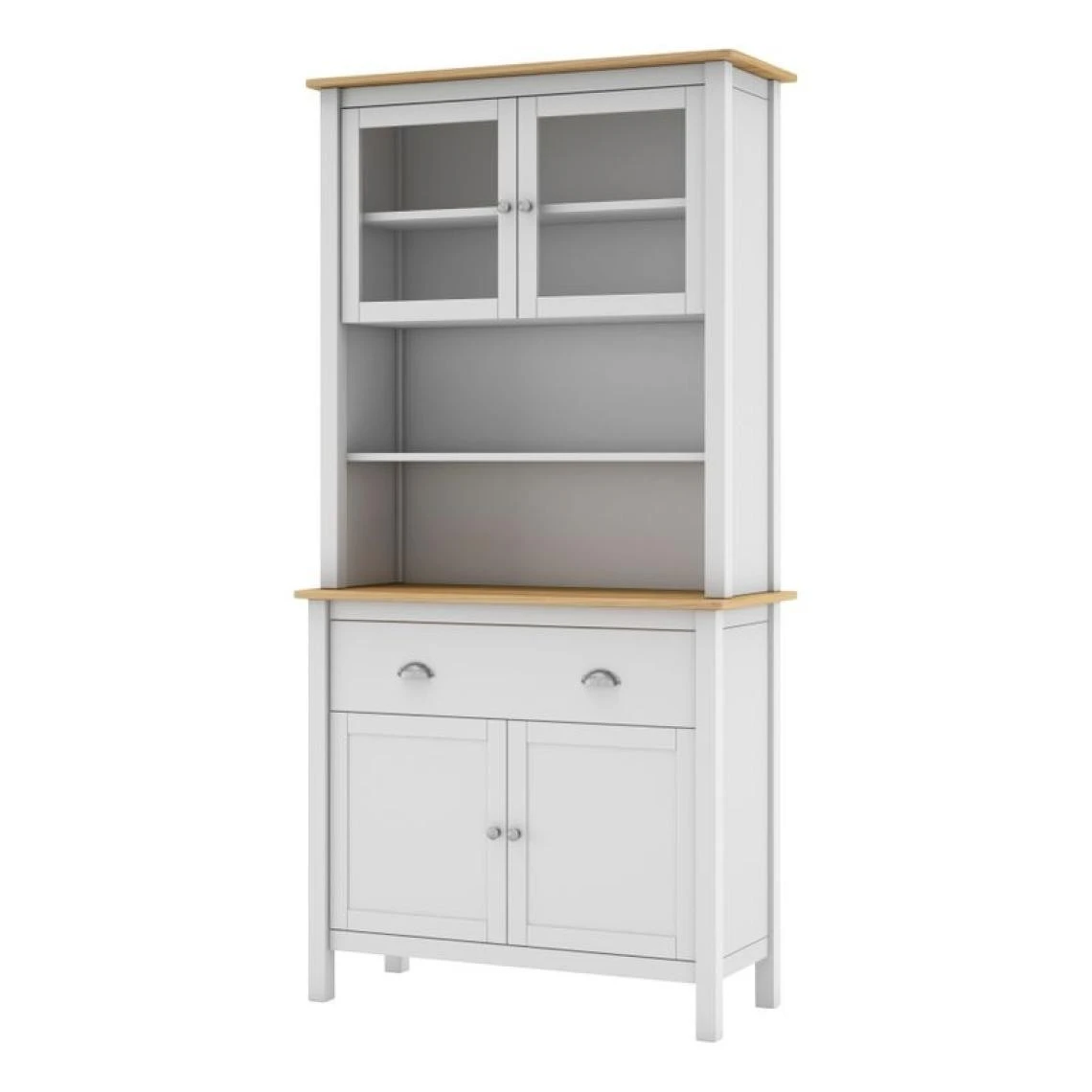 Portes :2 portes vitrées; 2 portes avec encadrement en pin massif. . Teinte :Blanc. . Vernis :Couleur chêne. . Tiroirs :2 – Pin massif, finition mate. . Finition :Mate . Garantie :2 ans . Etagères :1 . Poignées :Rondes métalliques couleur argent. . Structure :En pin massif . A monter soi-mêmeOui . Dimensions en cm : L.90 x H.180 x l.40 cm . Dispo pcs détachées donnée fournisseur :NC .