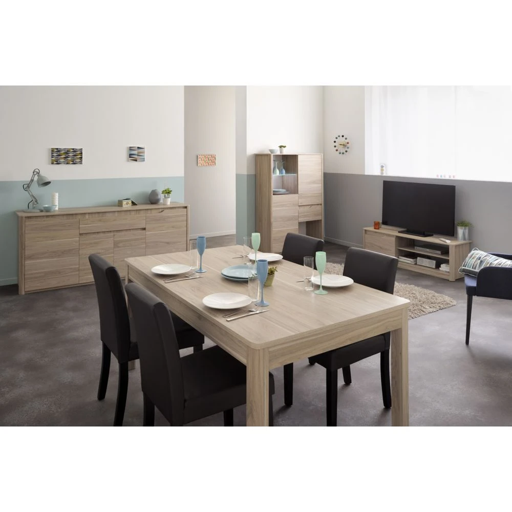 De nombreux rangementsD’un encombrement standard, ce buffet L. 185,3 x H. 85,5 x l. 45,8 cm s’installe facilement dans une pièce de taille moyenne. Fonctionnel, ce meuble de fabrication française vous offre de nombreuses possibilités de rangement. Chacune de ses deux grandes portes latérales dissimule ainsi un espace divisé par une étagère, parfait pour ranger vaisselle et linge de table. Sa partie centrale comporte une vaste niche fermée par deux portes battantes. Elle est surmontée d’un large tiroir. Vous pouvez placer sur son long plateau un vase, des plantes ou des bibelots. Facile à entretenir, le buffet WENDY se dépoussière à l’aide d’un chiffon doux.Un design élégant et discretDoté de poignées prises de main intégrées aux portes, ce buffet imitation chêne séduit les amateurs de design discret et épuré. Formé de panneaux de particules couverts de papier, il adopte un design nature. Ce buffet s’intègre volontiers dans une salle de séjour ou une entrée de même style.