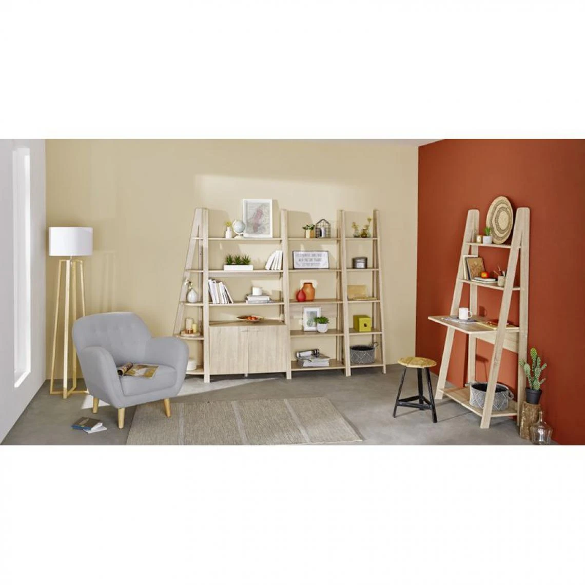 Cette étagère imitation chêne est idéale pour mettre en place une atmosphère nordique dans votre intérieur. Les Scandinaves sont en effet particulièrement friands des étagères-échelles qui libèrent de l’espace au sol sans surcharger une pièce. Vous pourrez en trouver de différents formats. Ce modèle s’assortit facilement aux tons blancs et pastel.