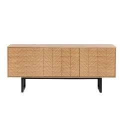 Ce buffet de la gamme KALMAR est revêtu d’un placage chêne naturel et imprimé aux motifs chevrons. Le tout sur un piétement moderne, en bois massif.