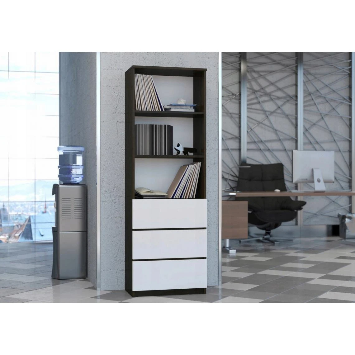 Dans votre bureau pour un espace de travail parfaitement rangé ou dans votre salon pour exposer votre belle collection de livres, la bibliothèque CAMELLA donne une véritable touche déco à chaque pièce et offre un bel espace de rangement. Cette grande bibliothèque vous permettra de ranger livres, documents et autres objets avec simplicité; POINTS FORTS: Design moderne; 3 tiroirs; 2 tablettes/3 niches de rangement; Fonctionnelle et élégante; Finition: aspect bois + faces de tiroirs en blanc mat; Fabriquée en Europe; CARACTÉRISTIQUES TECHNIQUES: Hauteur : 180 cm; Profondeur : 33 cm; Largeur : 60 cm; Corps et faces – panneau stratifié; Bordures – finition en PVC ; Meuble à monter soi-même à l’aide de la notice fournie