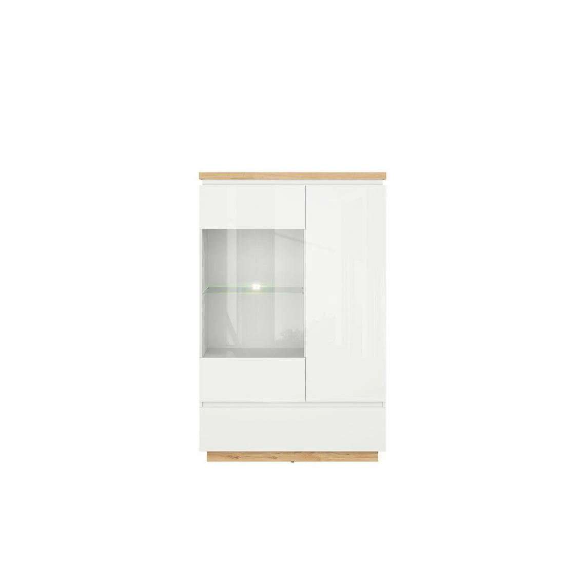 La vitrine comporte 5 tablettes dont 1 en verre, et un large tiroir situé dans la partie inférieure du meuble. Grâce à l’utilisation du stratifié, le plateau de la vitrine est plus résistant aux rayures. Les façades sans poignées soulignent le caractère unique du meuble, et l’utilisation confortable du meuble est assurée par les charnières à fermeture silencieuse. L’offre ne comprend pas l’éclairage, POINTS FORTS: Style scandinave, 2 portes+1 tiroir, Construction sûre en verre trempé, Finition corps mat+imitation bois ; façades brillantes, Fabriqué en Europe, CARACTÉRISTIQUES TECHNIQUES: Profondeur 41 cm, Largeur 98 cm, Hauteur 153 cm, Matériau : panneau de meuble/stratifié+verre trempé, À monter soi-même