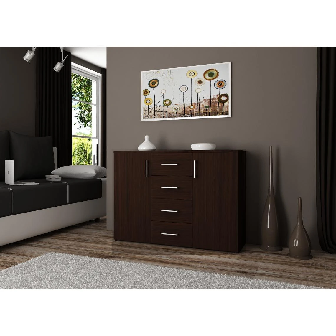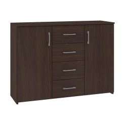 Pratique et plein d’élégance le buffet ELTON offre un grand volume de rangement en enfilade et une finition soignée et détaillée. Cette enfilade saura s’intégrer parfaitement dans chaque intérieur. Sa structure est fabriquée en panneaux de particules mélaminés de première qualité., POINT FORTS: 4 tiroirs, Grandes niches de rangement, Robuste, résistant et très stable, Solution parfaite pour l’économie et l’optimisation de l’espace, Poignées décoratives, CARACTÉRISTIQUES TECHNIQUES: Dimensions: 110x80x35 cm, Poids: 47 kg, Structure en panneaux bois 16mm, Chants ABS – Résistance aux rayures et à l’abrasion, Meuble à monter soi-même à l’aide de la notice fournie