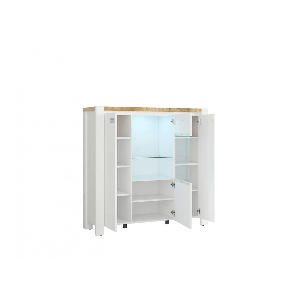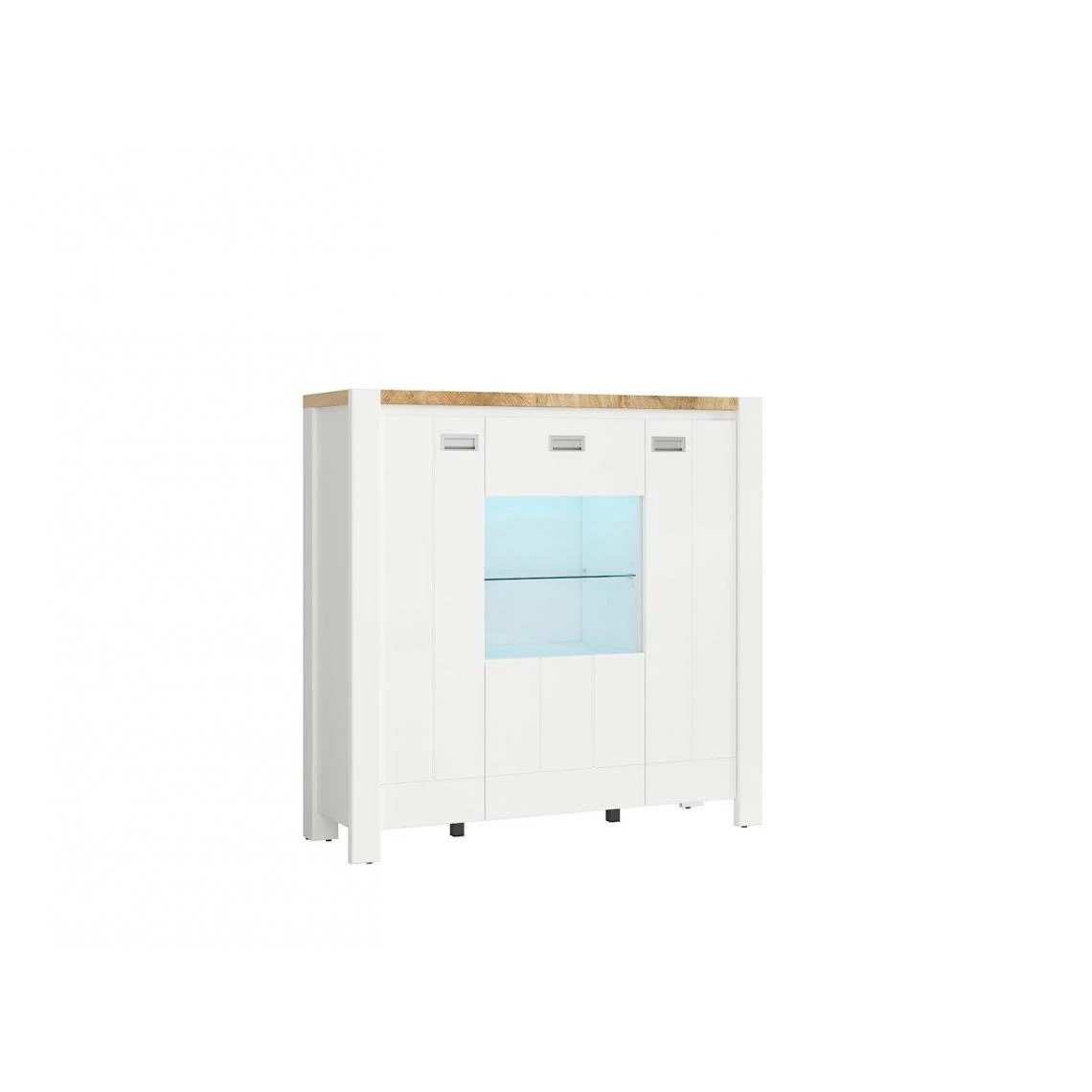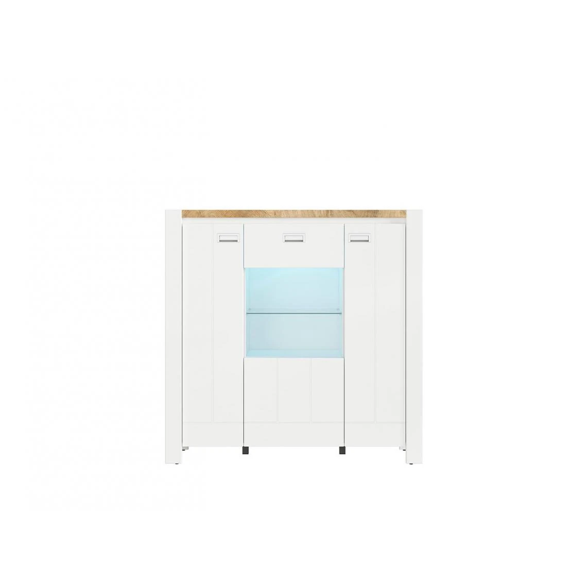 La vitrine possède 12 compartiments spacieux et une face en verre trempé qui est sûr à usage. Le caractère des meubles est souligné par des rainures verticales sur les faces et des poignées originales. L’éclairage disponible en standard mettra en valeur l’exposition et facilitera la création d’une ambiance unique dans l’appartement, POINTS FORTS: Style scandinave, 3 portes+12 compartiments, Éclairage soulignant le caractère unique du mobilier, Cernes naturels du bois visibles, Finition: Blanc mat/aspect bois, CARACTÉRISTIQUES TECHNIQUES: Profondeur 41.5 cm, Largeur 125 cm, Hauteur 124 cm, Matériau : panneau de meuble/MDF, À monter soi-même