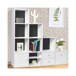 Descriptif de l’étagère escalier 4 niveaux bois blanc fond grisDécouvrez un charmant meuble en escalier blanc, au fond gris, qui s’intégrera à merveille dans votre chambre, bureau ou salon.Ce meuble multicases offre de nombreuses possibilités de rangement, grâce à ses 10 casiers répartis en étagères, sur 4 niveaux. Choisissez de disposer vos objets de déco, vos livres, vos CD ou de ranger vos documents importants en toute discrétion dans les différents espaces de rangement : placard, tiroirs coulissants, étagères.Avec un design aussi épuré et classique, l’étagère escalier blanc ID Market est le meuble parfait pour votre intérieur. Grâce à sa forme en dégradé, le meuble en escalier est idéal pour créer une séparation artificielle entre différents espaces d’une même pièce. Ainsi ce meuble trouvera sa place dans un studio ou autre logement, faisant office de cloison pour séparer le coin nuit de l’espace de travail, par exemple.En résumé, ce meuble en escalier est l’allié parfait des petits espaces en offrant une grande possibilité de rangements, pour une déco tendance grâce à ce dégradé de hauteurs. Plantes vertes, photos, cadres… tous trouveront leur place et seront mis en valeur sur ce meuble en bois à petit prix.Sa structure en panneau de particules d’une épaisseur de 12 mm lui confère une grande solidité.Le contraste moderne blanc/gris du meuble donnera de la perspective à votre intérieur !Découvrez sans plus attendre cette ingénieuse solution de rangement. Profitez-en dès maintenant !Les atouts de ce meuble escalier pas cher n’ont pas fini de vous étonner ! Espaces fermés ou ouverts, à vous de choisir ! Dimensions du meuble escalier multicases bois1 meuble escalier 4 niveaux : dimensions : L.117 x H.117 x P. 30 cm+ 1 porte de placard avec poignée grise : dimensions : L.27,6 x l.27,6 x 1,2 cm+ 1 étagère pour créer une séparation supplémentaire : dimensions : L.27,6 x l.30 x 1,2 cm+ 2 tiroirs coulissants avec poignée grise : dimensions : L.27,6 x l.25 x H.13,5 cm+ 1 grand tiroir coulissant avec poignée grise : dimensions : L.27,6 x l.25 x H.27,6 cm+ Fonds pleins gris