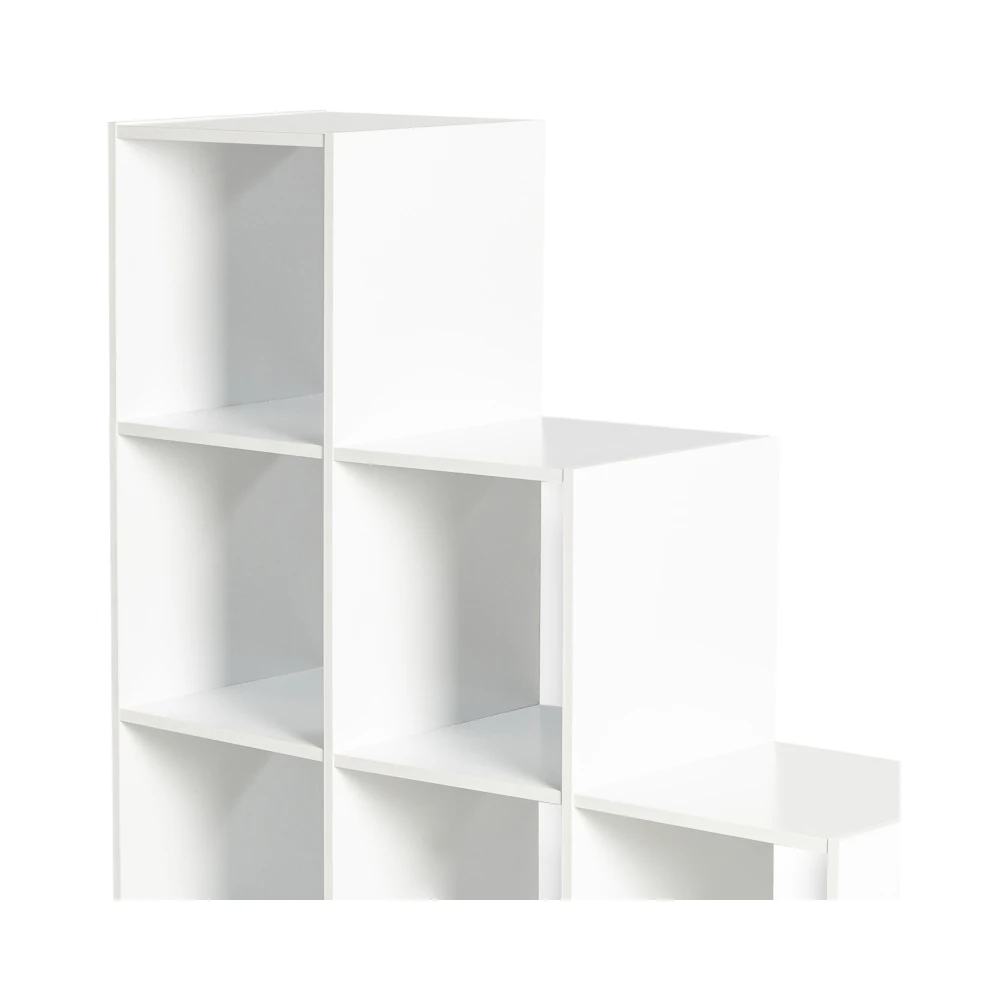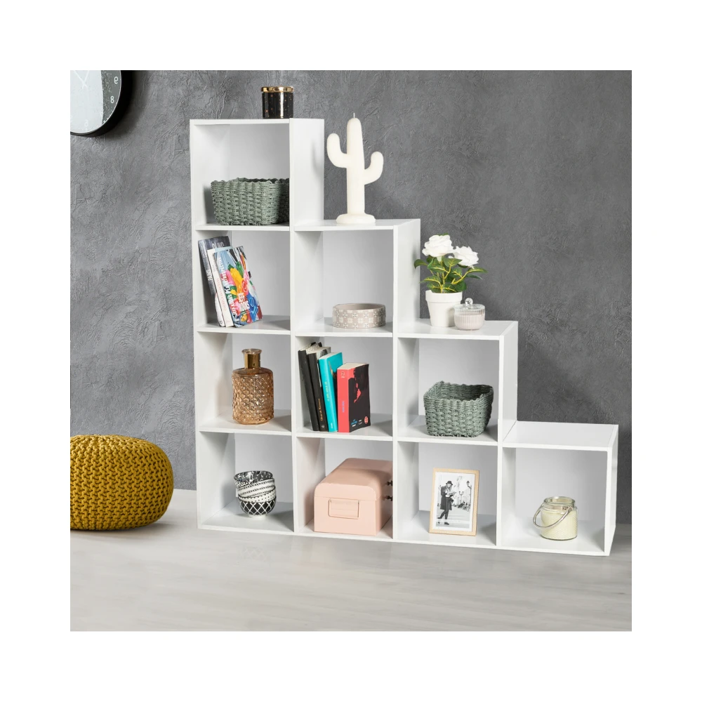 Descriptif de l’étagère escalier 4 niveaux bois blanc Découvrez un charmant meuble en escalier blanc ton sur ton qui s’intégrera à merveille dans votre chambre, bureau ou salon.Ce meuble multicases offre de nombreuses possibilités de rangement, grâce à ses 10 casiers répartis en étagères, sur 4 niveaux. Choisissez de disposer vos objets de déco, vos livres, vos CD comme bon vous semble. Grâce à sa maxi capacité de rangement chaque objet trouvera une place de choix !Avec un design aussi épuré et classique, l’étagère escalier blanc ID Market est le meuble parfait pour votre intérieur. Grâce à sa forme en dégradé, le meuble en escalier est idéal pour créer une séparation artificielle entre différents espaces d’une même pièce. Ainsi ce meuble trouvera sa place dans un studio ou autre logement, faisant office de cloison pour séparer le coin nuit de l’espace de travail, par exemple.En résumé, ce meuble en escalier est l’allié parfait des petits espaces en offrant une grande possibilité de rangements, pour une déco tendance grâce à ce dégradé de hauteurs. Plantes vertes, photos, cadres… tous trouveront leur place et seront mis en valeur sur ce meuble en bois à petit prix.Sa structure en panneau de particules d’une épaisseur de 12 mm lui confère une grande solidité.La couleur blanche du meuble, à la fois chic et intemporelle, donnera de la luminosité à votre intérieur !Découvrez sans plus attendre cette ingénieuse solution de rangement. Profitez-en dès maintenant !Les atouts de ce meuble escalier pas cher n’ont pas fini de vous étonner !Dimensions du meuble escalier multicases bois blanc1 meuble escalier 4 niveaux : dimensions : L.117 x H.117 x P. 30 cm+ Fonds pleins blanc ton sur tonAutres modèles et coloris disponibles sur notre boutique en ligne :Meuble escalier 3 niveaux BLANCMeuble escalier 3 niveaux façon HETREMeuble escalier 4 niveaux BLANCMeuble escalier 4 niveaux façon HETREMeuble escalier 4 niveaux BLANC fond GRISMeuble escalier 4 niveaux bois gris fond gris