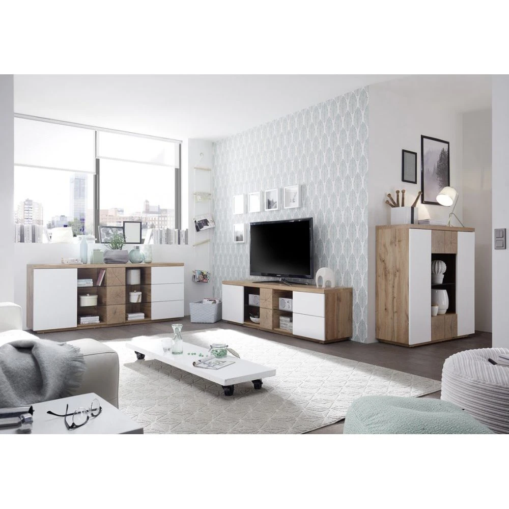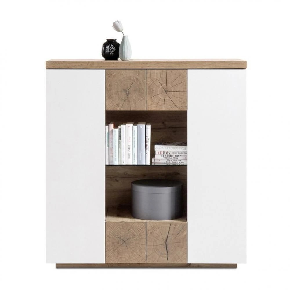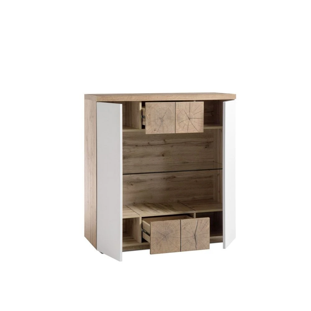 Points forts Inside 75 Buffet haut HERNING 114 cm laqué blanc mat décor chêne noueux 2 portes 2 tiroirs