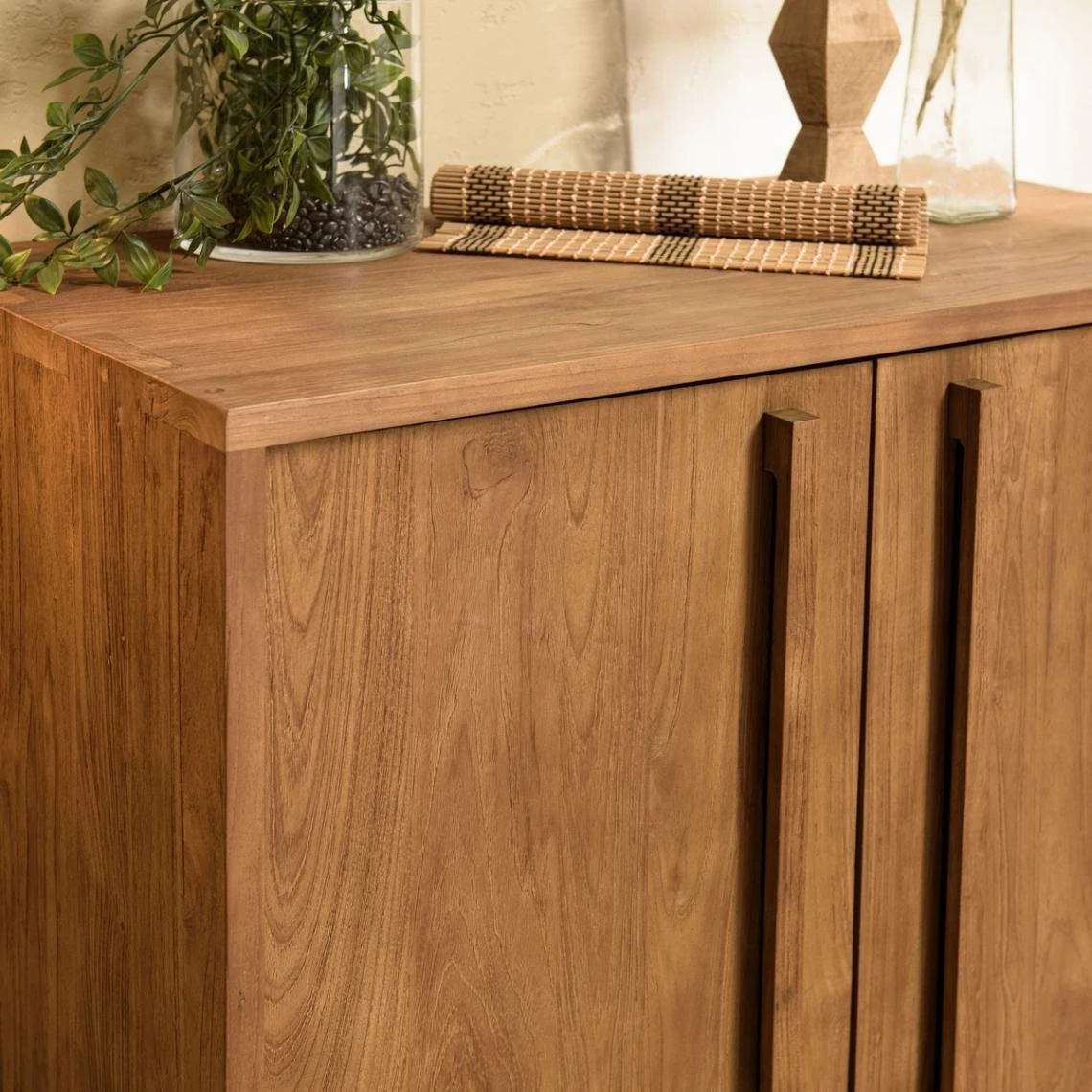 Décorez votre salon ou encore votre salle à manger avec ce superbe Buffet 2 portes en bois de teck recyclé pieds en métal noir. Très épuré, il fascine avec son aspect rustique chic et ses pieds en acier qui lui confèrent robustesse et stabilité. Avec ses nombreux compartiments de rangements, il peut accueillir divers objets.