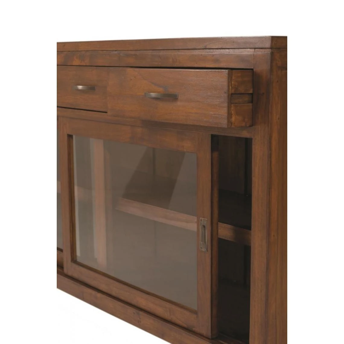 Buffet 3 tiroirs sous plateau, 2 portes coulissantes vitrées en bois mindi