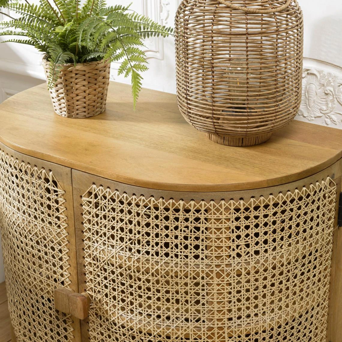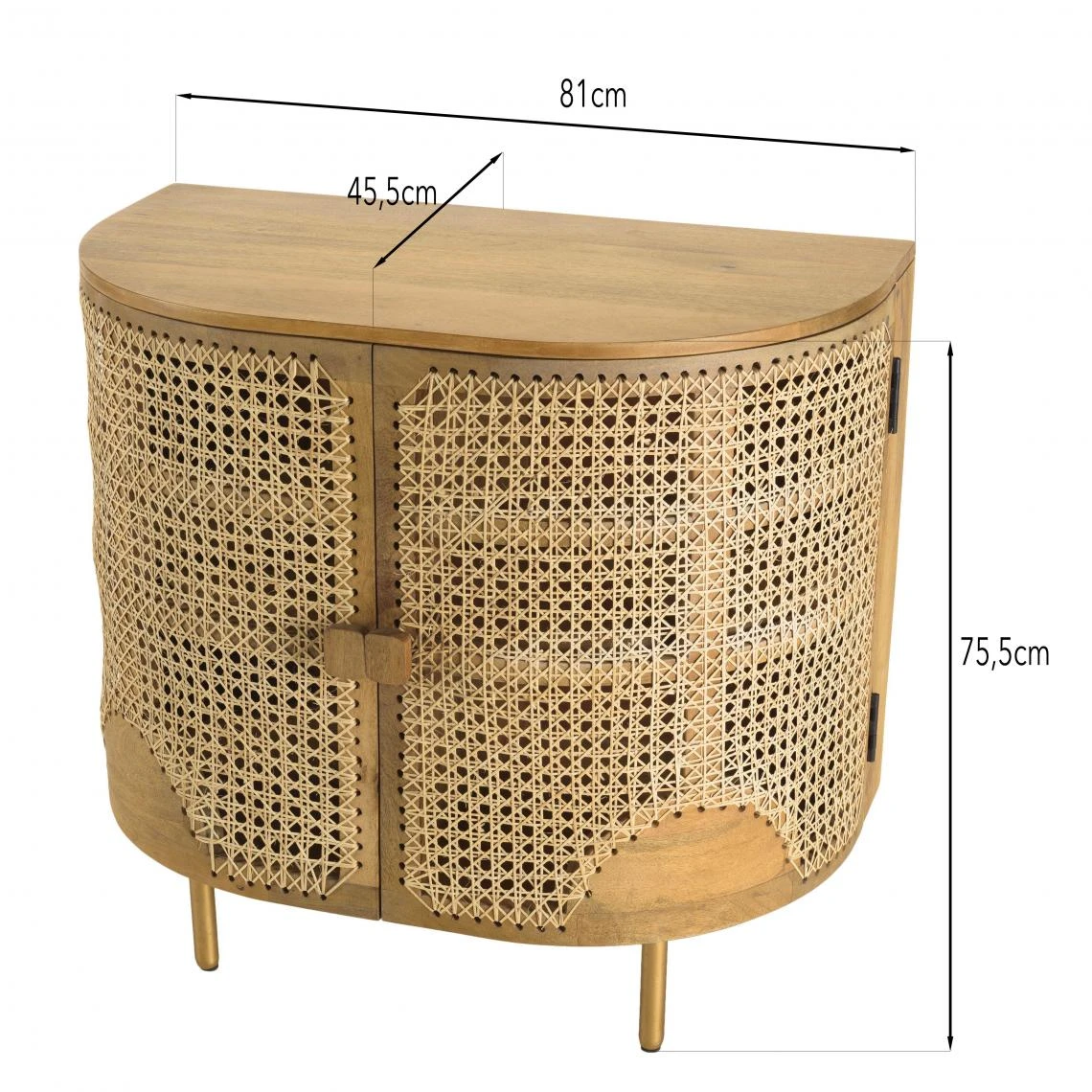 Buffet marron 2 portes bois de manguier et cannage pieds métal doré Imaginez ce buffet naturel 2 portes chez vous… Sa forme arrondie est totalement dans l’air du temps et rend ce meuble original. Petit mais pratique, il possède 2 étagères qui permettent un rangement optimal. Ce meuble est doté de 4 pieds en métal doré qui apportent une petite touche chic.