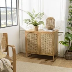 Ce buffet naturel 2 portes est totalement tendance grâce à ses portes en rotin qui le rendent aéré et épuré. Son cadre inférieur en métal doré apporte énormément d’élégance.