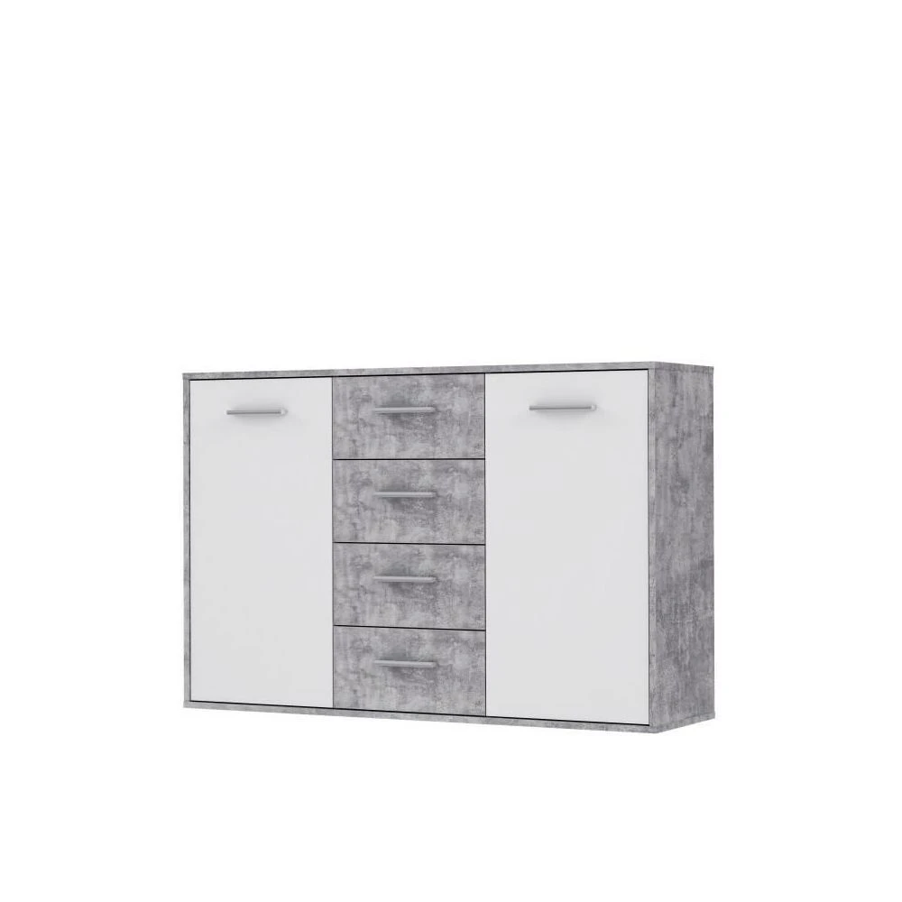 Points forts marque generique PILVI Buffet bas 2 portes 4 tiroirs – Blanc et béton gris clair – L 122,6 x P 34,2 H 88,1 cm