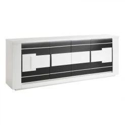 Un grand espace de rangementFabriqué en Europe, le buffet BELLARIVA associe un grand espace de rangement et un style contemporain unique. Il dispose de 4 portes révélant des niches aménagées avec une étagère à mi-hauteur et un tiroir au niveau de la partie centrale. Ce buffet de L. 220 – H. 85 – P. 46 cm peut servir à entreposer de la vaisselle, mais aussi des accessoires de décoration ou des jeux de société, par exemple. Les portes sont dotées d’un système de fermeture avec ralentisseur soft close qui évite les bruits et les chocs. Vous pouvez nettoyer votre buffet en panneaux de particules avec un chiffon légèrement humidifié.Une salle à manger contemporaineCe buffet blanc/gris se distingue par son style contemporain et son alliance de coloris qui rappelle l’Art déco. Ses portes laquées haute brillance sont mises en valeur par un système d’éclairage à LED qui permet de créer une lumière d’ambiance chaleureuse et agréable. La collection BELLARIVA comprend également un meuble TV, une vitrine et une table.