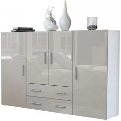 Buffet avec 4 portes et 2 tiroirs Corps (panneau supérieur et côtés) en blanc mat MDF Façades blaches gris sable haute brillance en MDF Avec poignées en Pvc Dimensions du buffet en cm (LxHxP): 166 x 106 x 35 couleur argent instructions de montage illustrées pour faciliter le montage