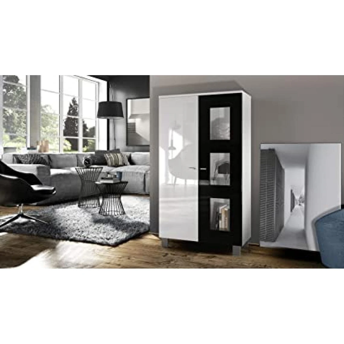 Points forts Mpc Vitrine sur pied avec 2 portes et 3 vitres, blanc mat/blanc haute brillance/noir haute brillance (71 x 129 x 35 cm)