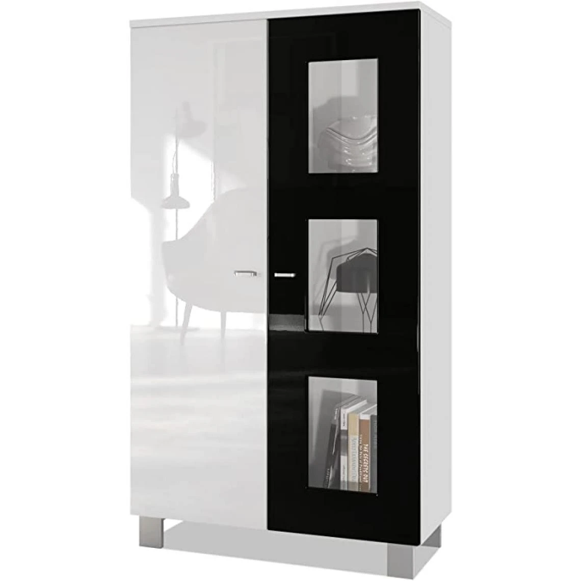 Meuble de rangement : Conçu pour optimiser l’espace de rangement, ce meuble vitrine affiche un style moderne. Il comprend un panneau arrière en fibres dures aspect bois, 2 portes ouvrant sur 6 vastes compartiments et 4 tablettes amovibles.