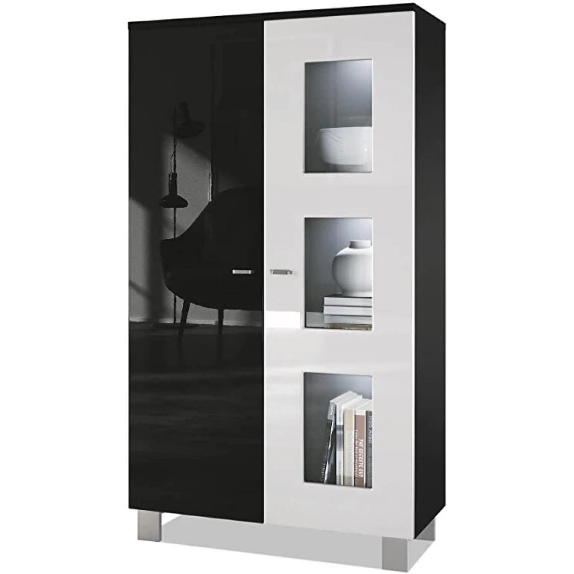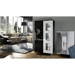 Meuble de rangement : Conçu pour optimiser l’espace de rangement, ce meuble vitrine affiche un style moderne. Il comprend un panneau arrière en fibres dures aspect bois, 2 portes ouvrant sur 6 vastes compartiments et 4 tablettes amovibles.