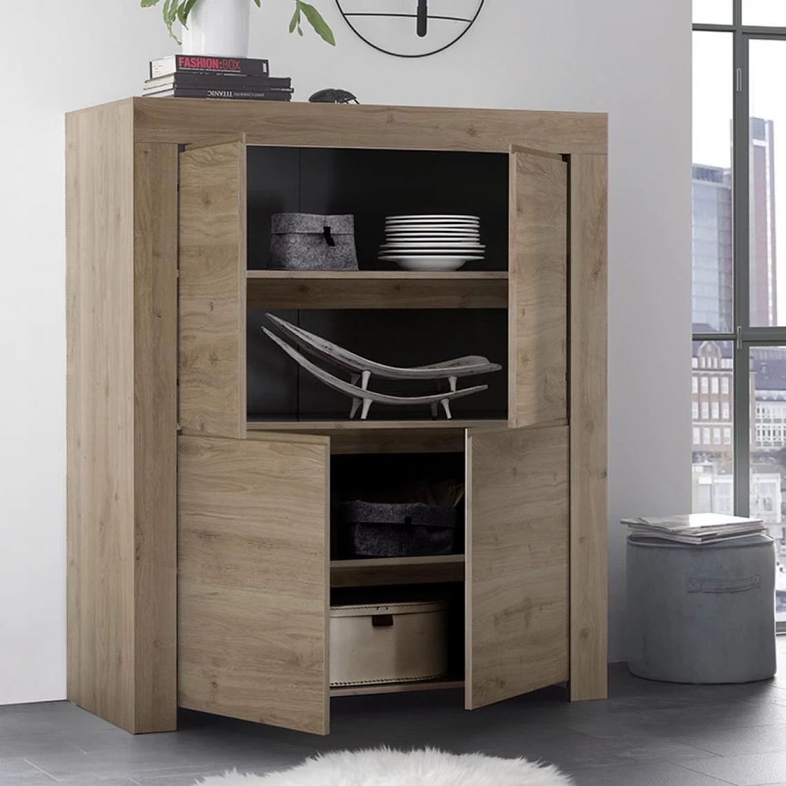 un argentier moderne 110 cm avec 4 portes, pour optimiser son séjour. très classe dans un séjour ou dans un salon, ce grand buffet haut quatre portes peut également avoir une place dans une cuisine moderne. les lignes droites sont symétriques pour s’adapter parfaitement aux autres meubles de la collection du fabricant. on peut donc assortir ce buffet haut coloris chêne avec un buffet ou une très jolie table de salle à manger. sa qualité de fabrication est un gage de confiance: spécialement sélectionné pour sa qualité remarquable, vous apprécierez l’aspect et la robustesse des matériaux utilisés. conçu en panneaux de particules de 1ère qualité, cette armoire 110 cm vous assure robustesse et durabilité. si la qualité est un critère indispensable pour votre séjour, le choix de cet argentier à 4 portes pleines est fait pour vous ! en faisant l’acquisition de ce produit, vous pourrez profiter du savoir-faire italien, reconnu pour son expérience dans la confection de mobilier. pour un ensemble harmonieux, associez-le avec les autres éléments de la même collection.