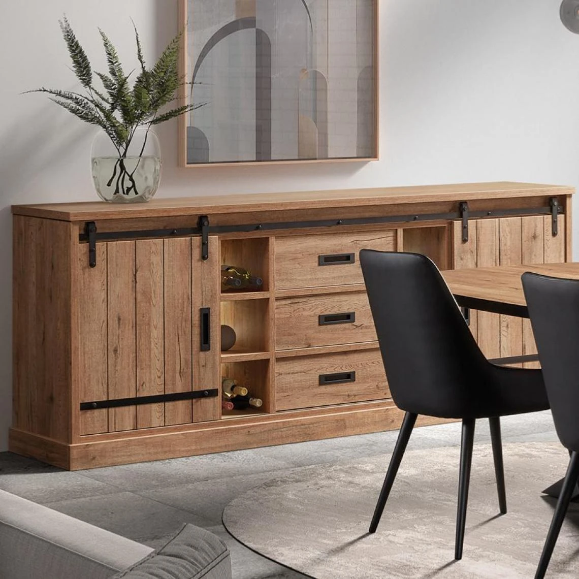 Moderne, chaleureux, tendance sont les adjectifs qui qualifient le mieux le buffet moderne PIERRE. Il va apporter une ambiance à la fois conviviale et élégante à votre intérieur. L’effet bois est très réaliste, il donne l’impression de bois massif. Les poignées noires et le rail mettent d’autant plus en valeur la beauté du bois. Le design du meuble de salle à manger rappelle l’aspect des meubles style coloniale, c’est pourquoi il sera parfait dans une décoration naturelle.