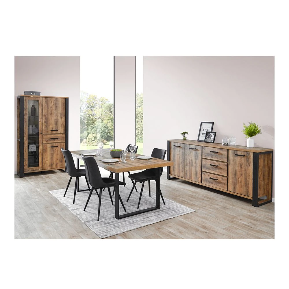 Meuble de salle à manger en panneaux de particules recouvert d’un papier décor bois foncé et noir.