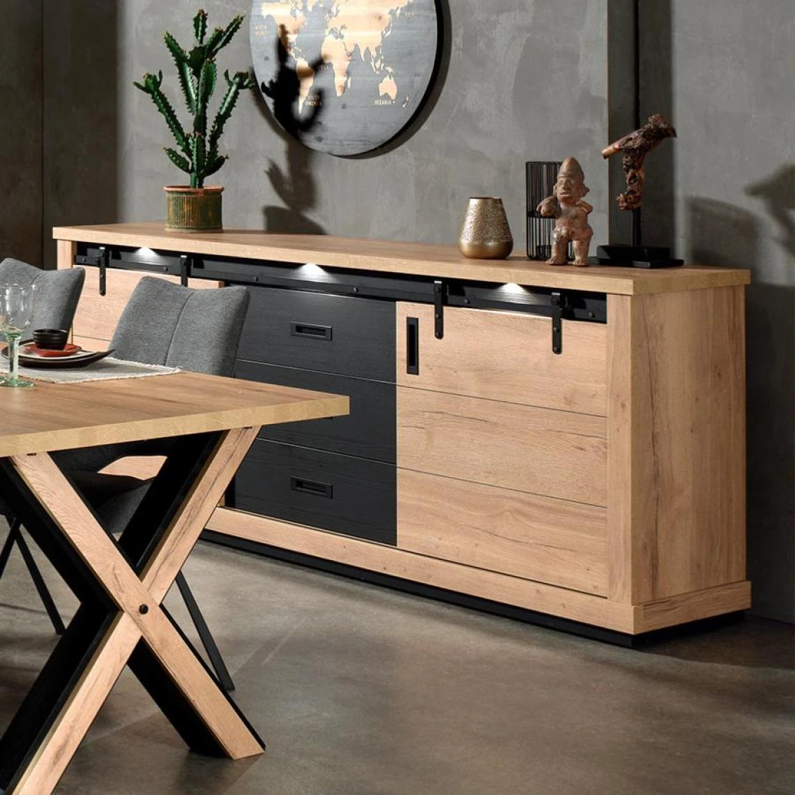 Points forts Nouvomeuble Buffet industriel couleur chêne clair DAKAR