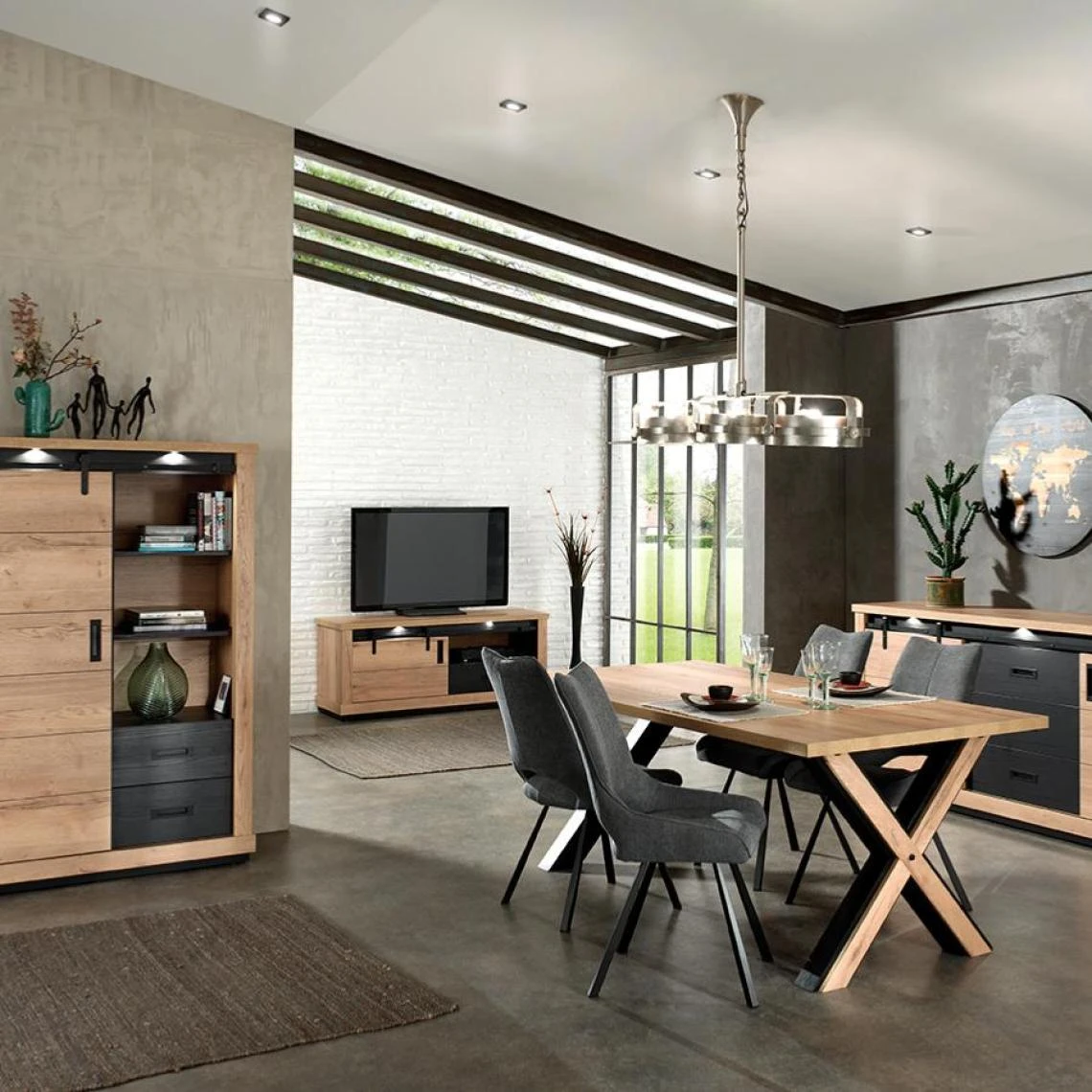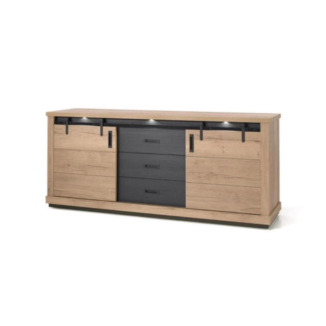Insufflez un vent de modernité à votre décoration intérieure avec le buffet DAKAR. Parfait pour une décoration actuelle, il reprend les codes du style industriel. Remarquez le rail pour les portes coulissantes, il donne beaucoup de charme au meuble. Les finitions noires s’associent toujours à merveille avec le coloris chêne, le meuble DAKAR ne fait pas exception à la règle.De qualité belge, le meuble de séjour est élaboré avec des matériaux de qualité. Livré monté, il est possible de démonter le buffet si vous en avez la nécessité.