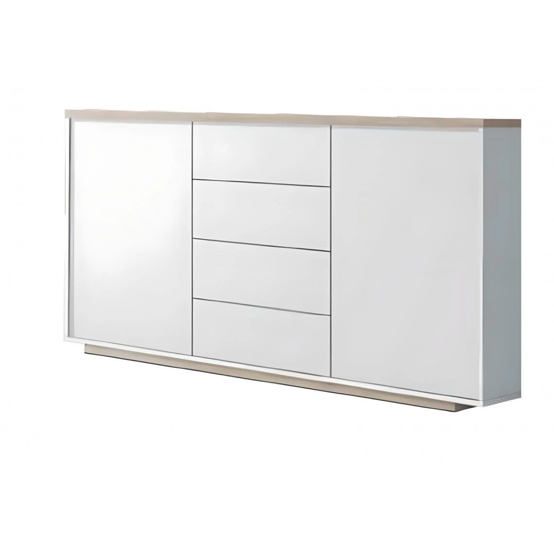 Buffet 2 portes + 4 tiroirs coloris Blanc / Chêne Cambrian en panneaux de particules mélaminés. Ses tiroirs disposent des glissières métalliques. Produit de fabrication espagnole. Meuble livré en kit.