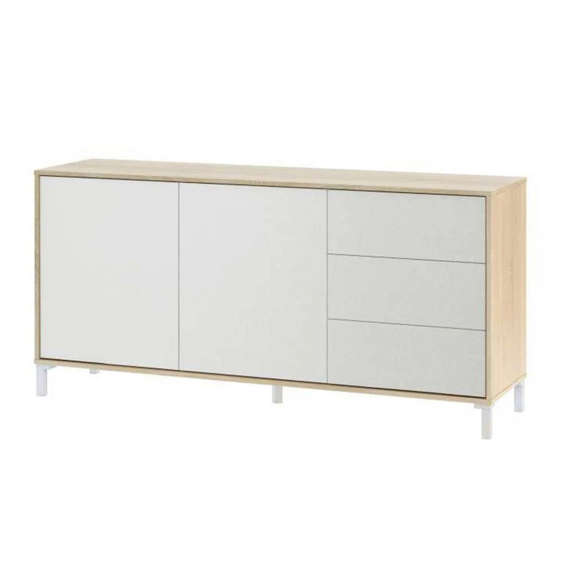 Points forts Pegane Buffet avec 2 portes et 3 tiroirs coloris chêne canadien / blanc artic – Hauteur 74 x Longueur 154 x Profondeur 41 cm