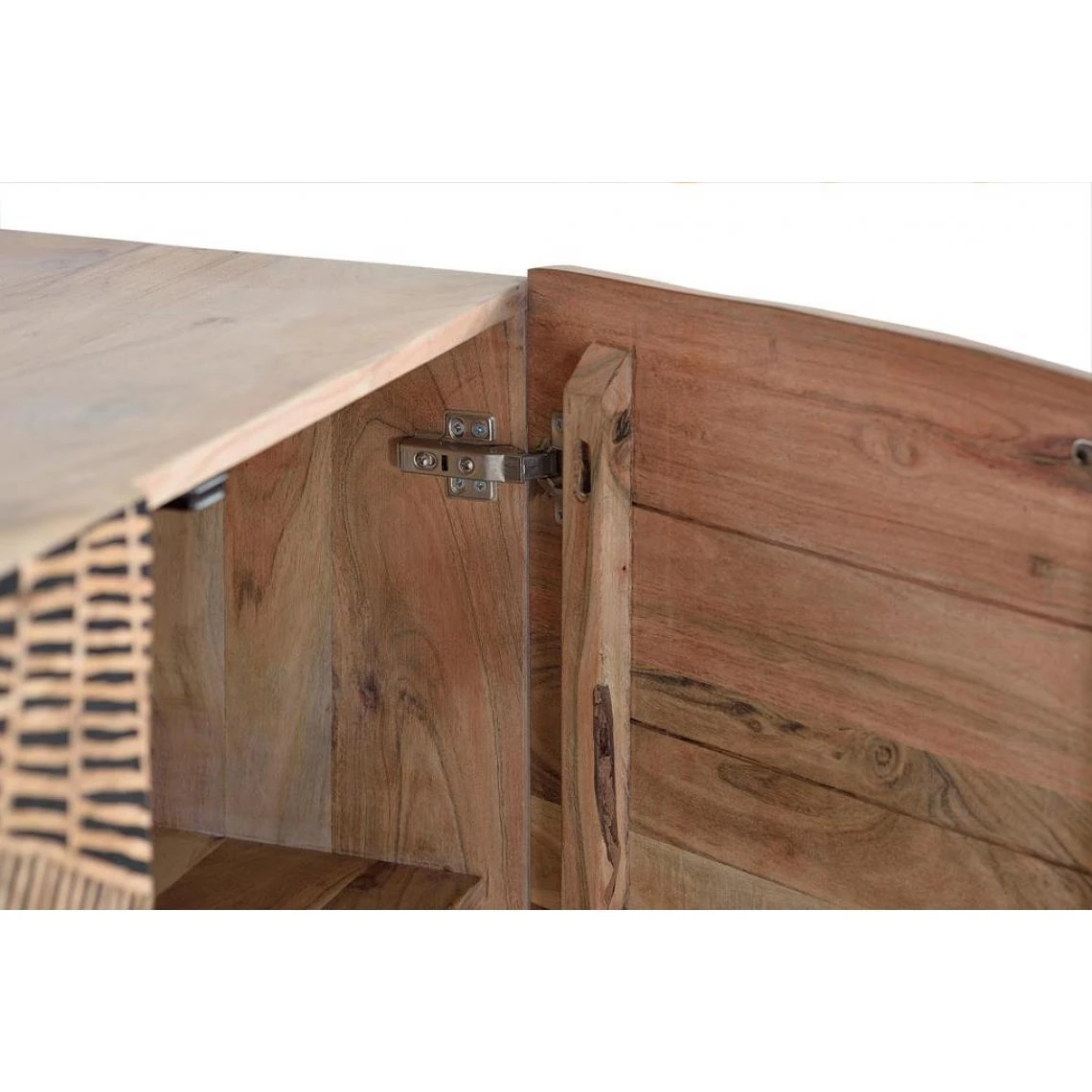 Buffet bahut équipé de 4 portes en bois d’acacia et base en métal, avec des détails sculptés à la main. Facile à nettoyer. Livré monté. Dimensions : longueur 200 x profondeur 40 x hauteur 90 cm