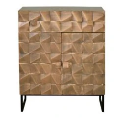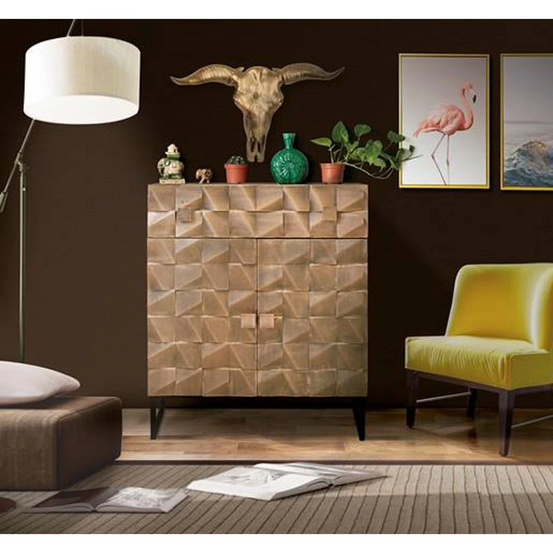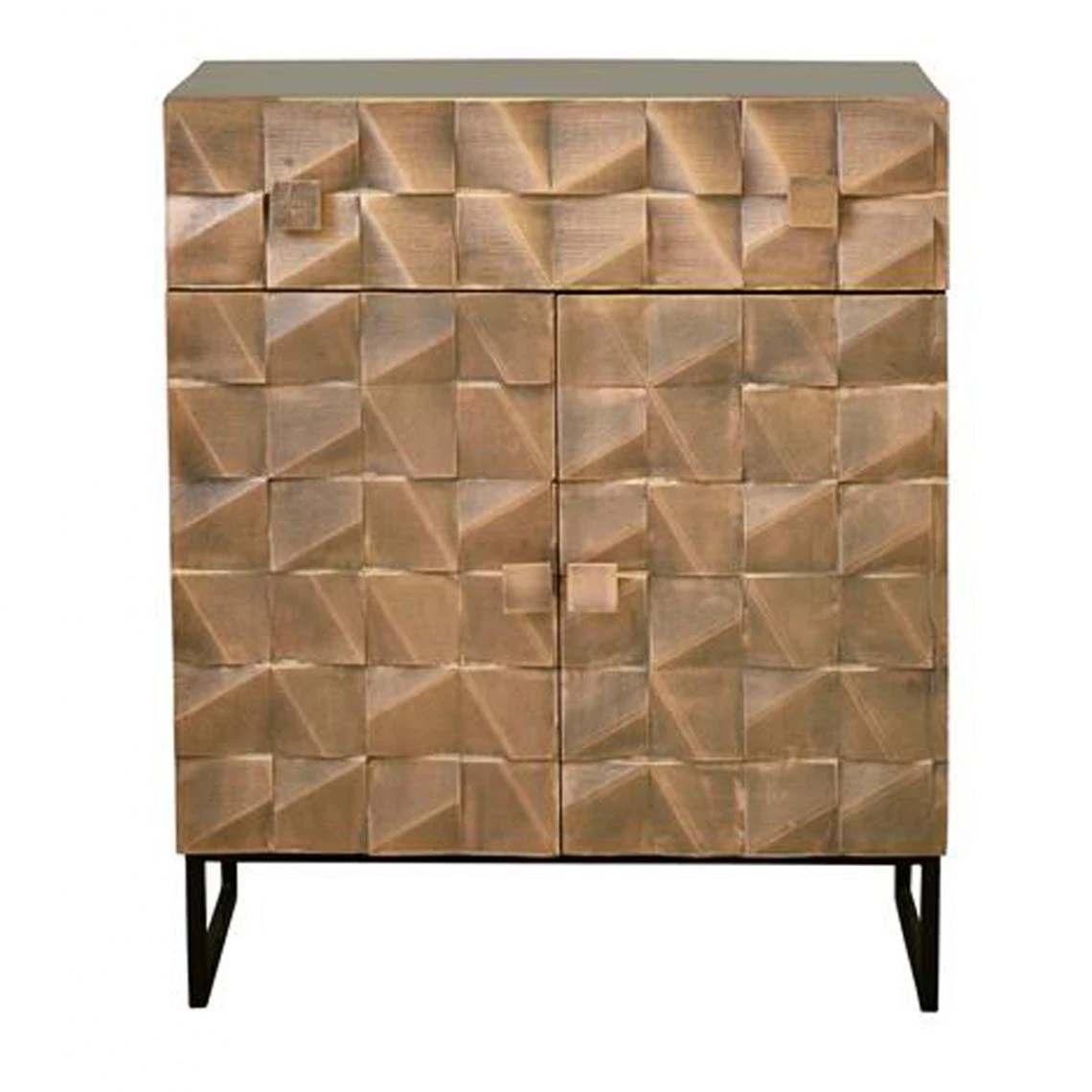 Buffet bahut équipé de 2 portes et 3 tiroirs en bois de manguier recouvert de feuille de cuivre emboutie. livré monté.