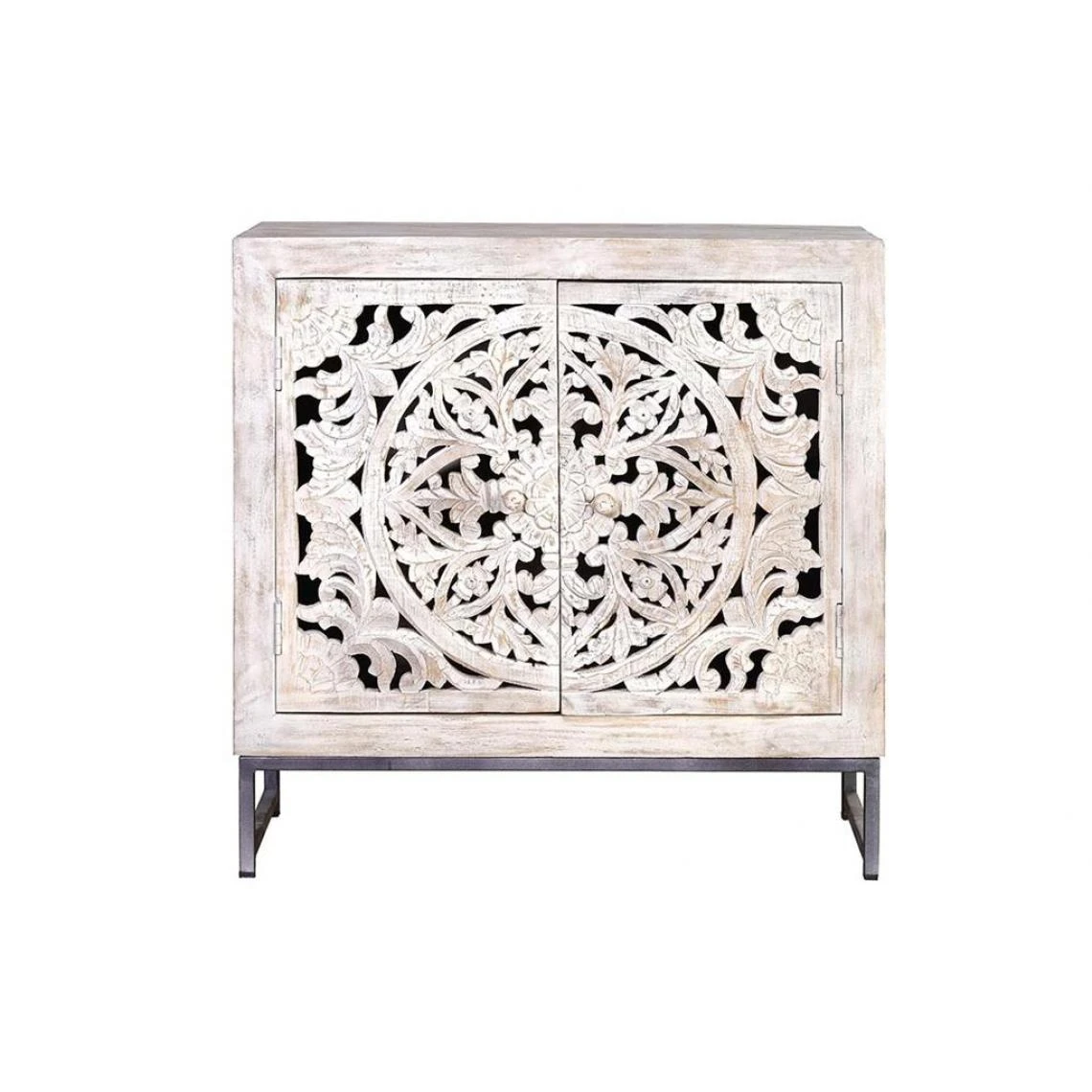 Buffet commode avec 2 portes en bois de manguier et base en métal. Facile à nettoyer. Livrée montée. Dimensions : longueur 80 x profondeur 35 x hauteur 81 cm Dimensions de la porte : hauteur 54 x longueur 35 cm Matière : bois de manguier, fer