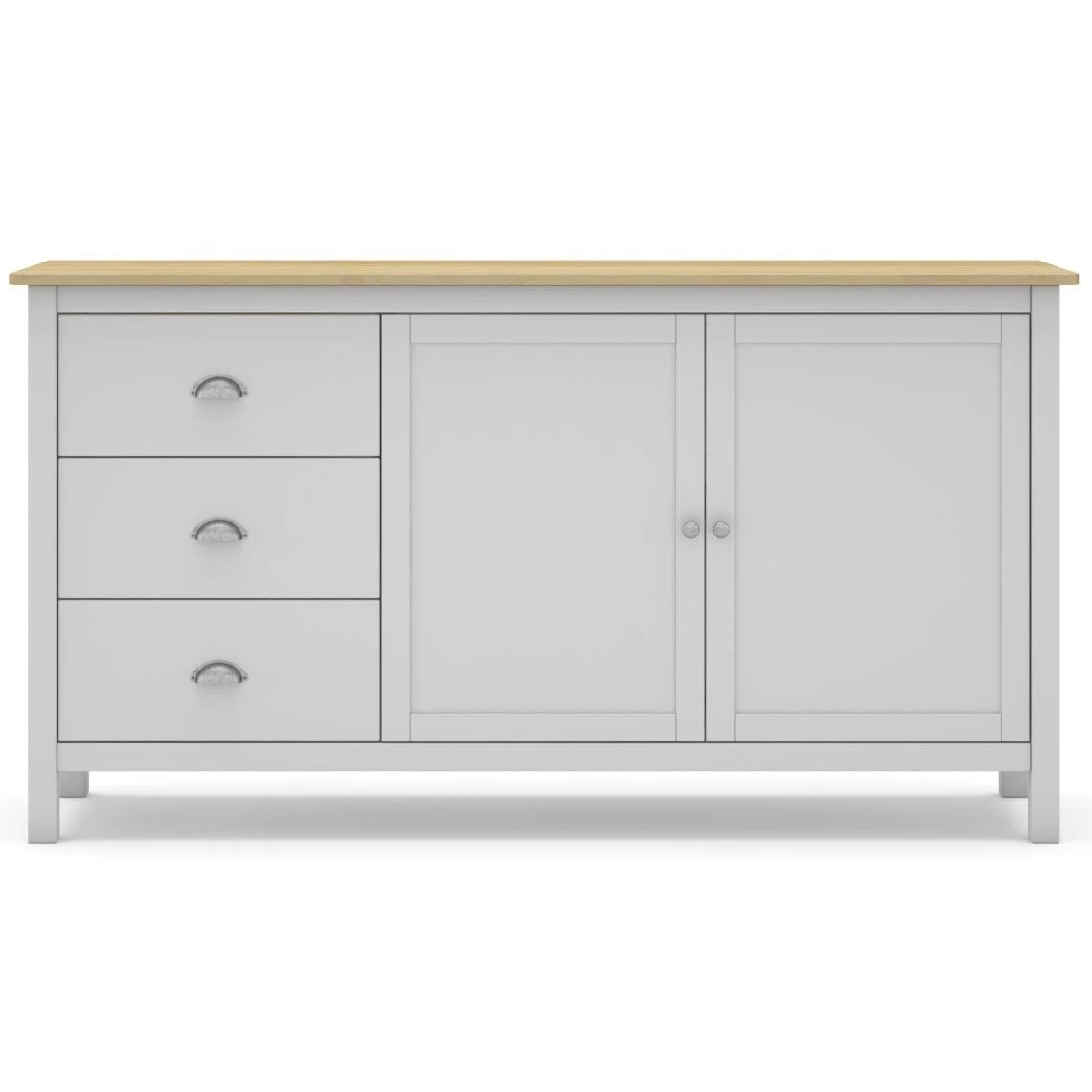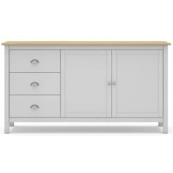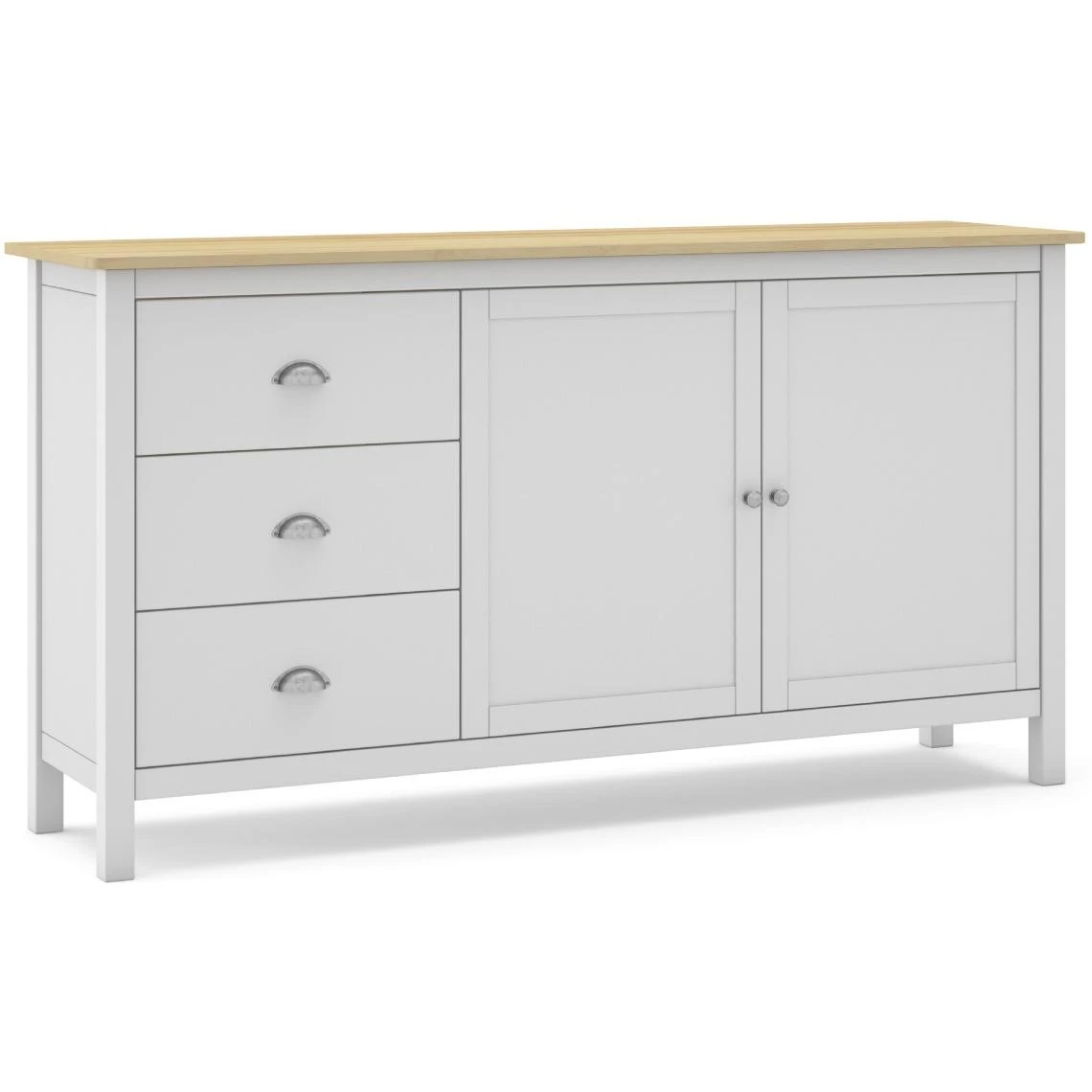 Buffet avec une structure en pin massif blanc et plateau couleur chêne. S’accorde avec de nombreux styles. Offre un espace de rangement spacieux grâce à 3 tiroirs et 2 portes. Design contemporain qui apportera une touche de modernité dans votre espace !