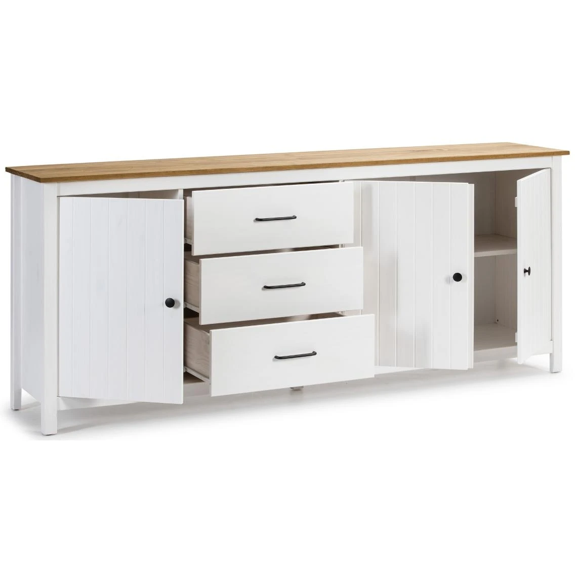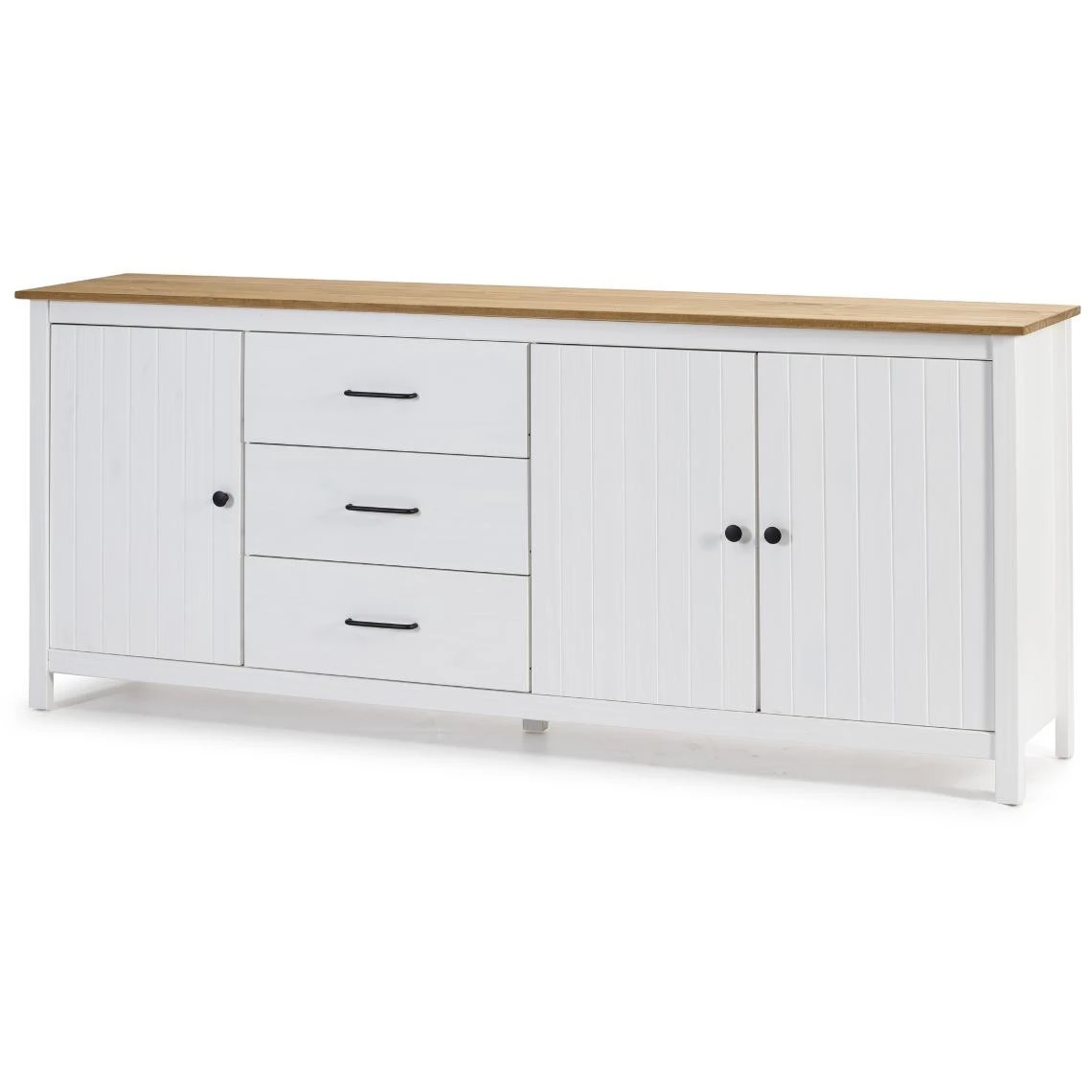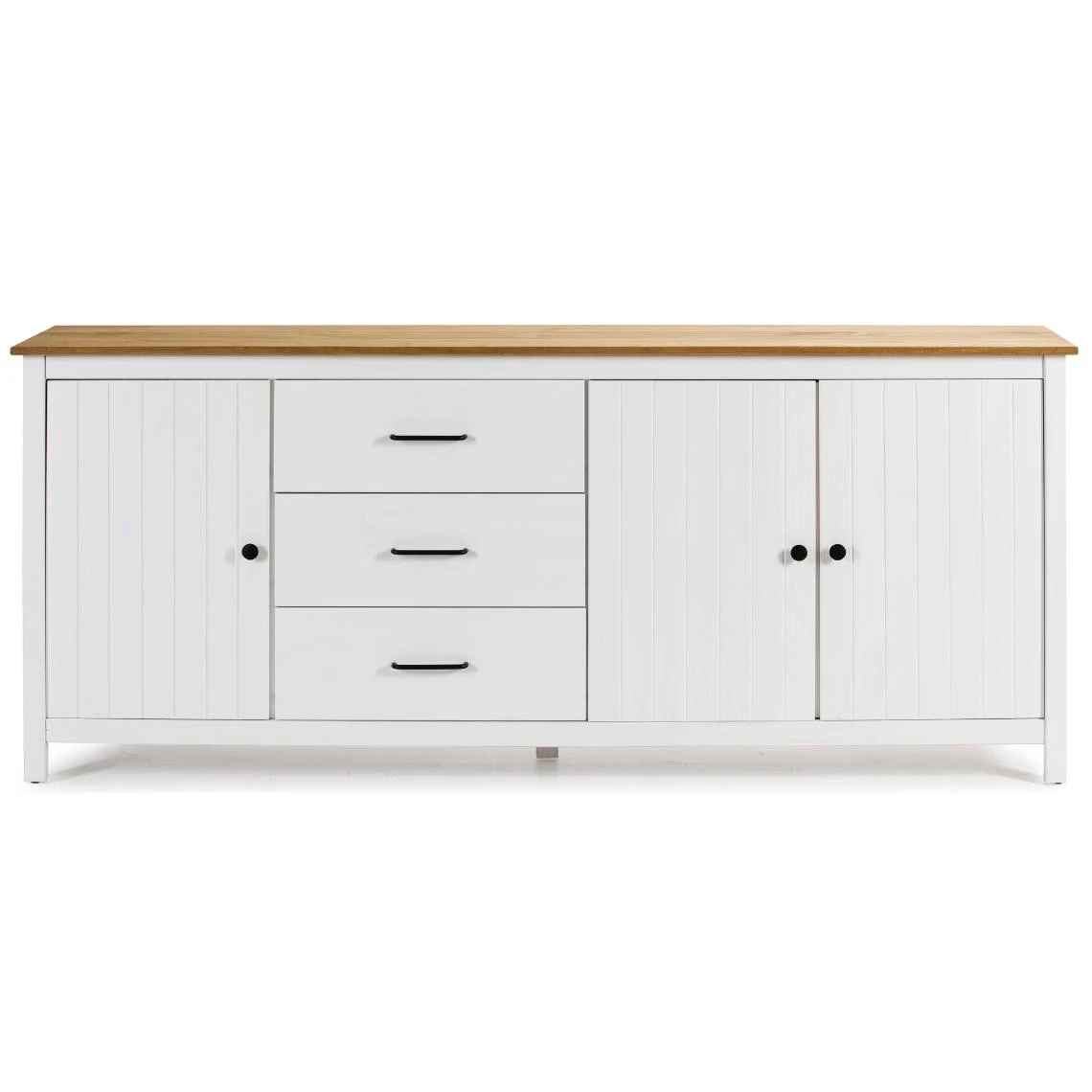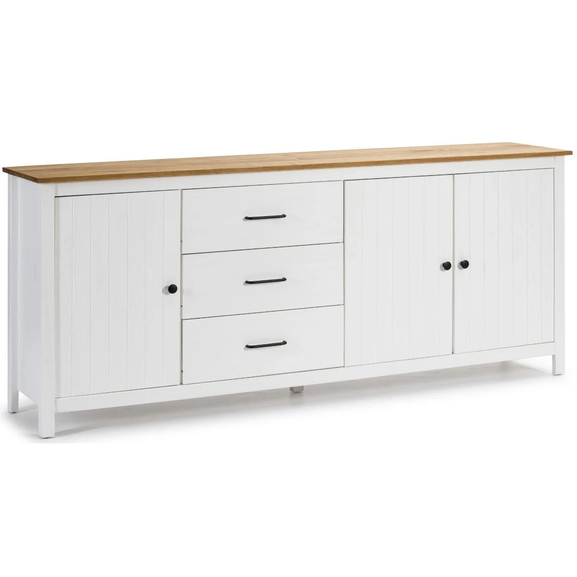 Buffet avec une structure en pin massif blanc et plateau ciré couleur chêne. S’accorde avec de nombreux styles. Offre un espace de rangement spacieux grâce à 3 tiroirs et 3 portes. Design contemporain qui apportera une touche de modernité dans votre espace !