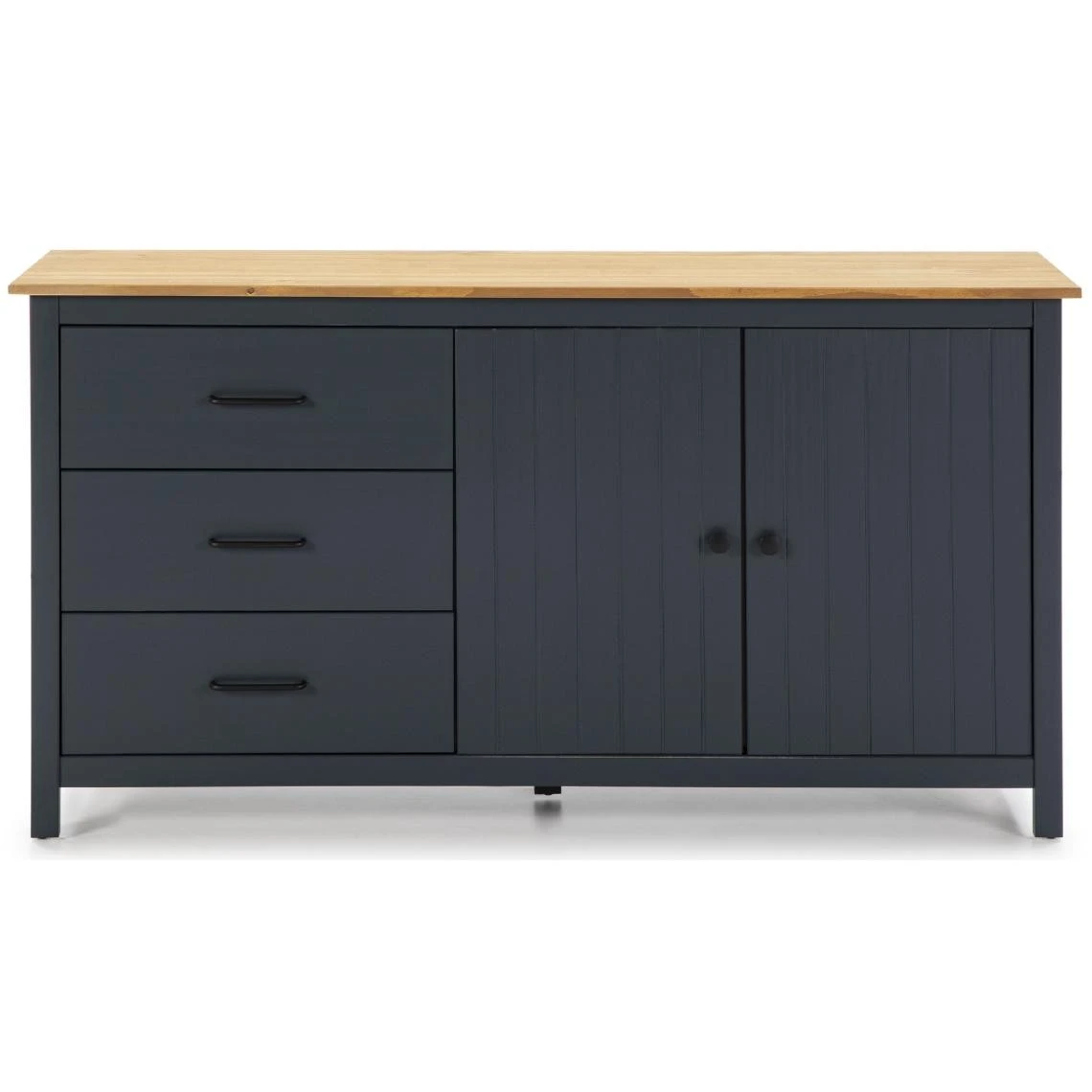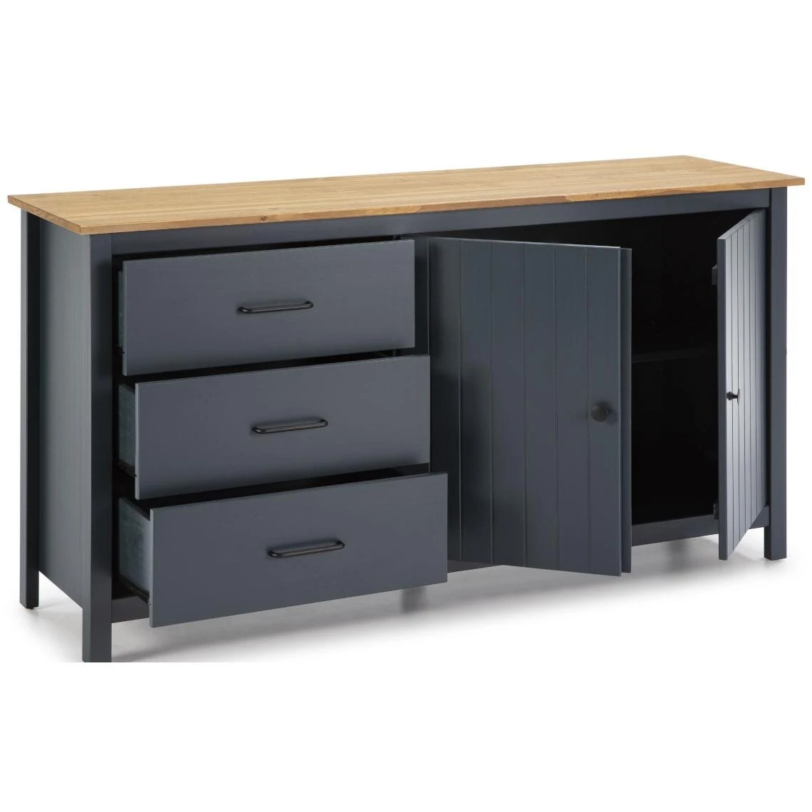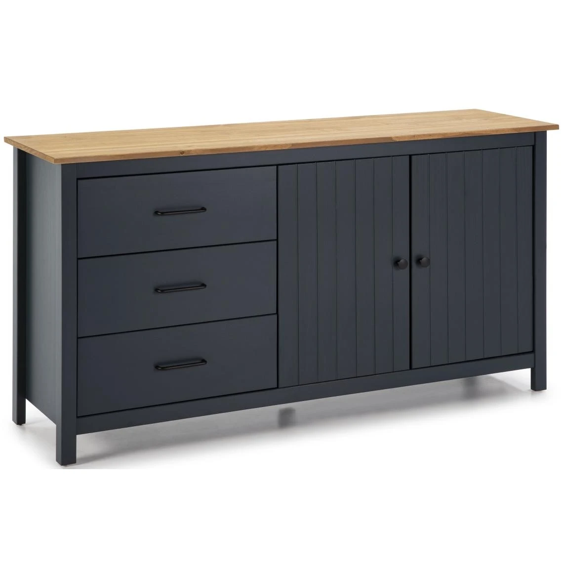Buffet avec une structure en pin massif bleu et plateau ciré couleur chêne. S’accorde avec de nombreux styles. Offre un espace de rangement spacieux grâce à 3 tiroirs et 2 portes.