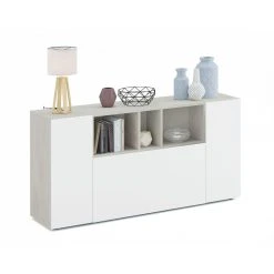 Buffet meuble 3 portes et 3 tablettes de rangement intérieur ( 1 pour chaque porte) 3 au total. Moderne et élégant. Moderne et élégant. Meuble d’appoint pour salon, salle à manger, entrée, pour n’importe quelle pièce de la maison. Buffet à 2 portes rabattables avec étagères réglables à l’intérieur, une autre porte battante de couleur blanc mat, avec une zone de niches, finition en bois dans la partie centrale.