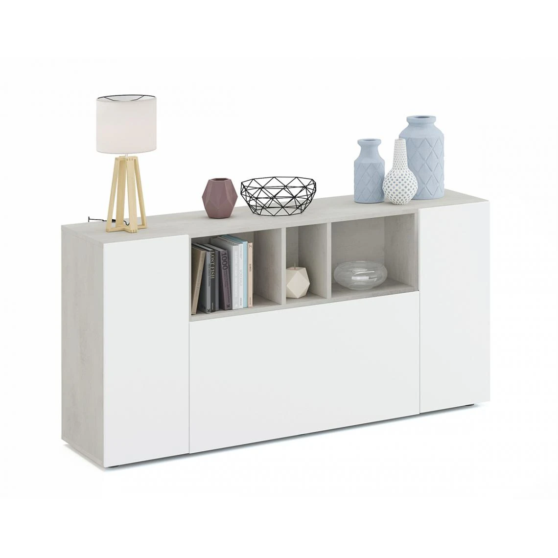Points forts Pegane Buffet meuble de rangement avec 3 portes coloris Béton / blanc artic – Longueur 150 x Hauteur 76 x Profondeur 41 cm