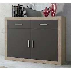 Buffet, meuble de rangement conçu en panneaux de particules mélaminés. Equipé de 2 tiroirs et 2 portes.